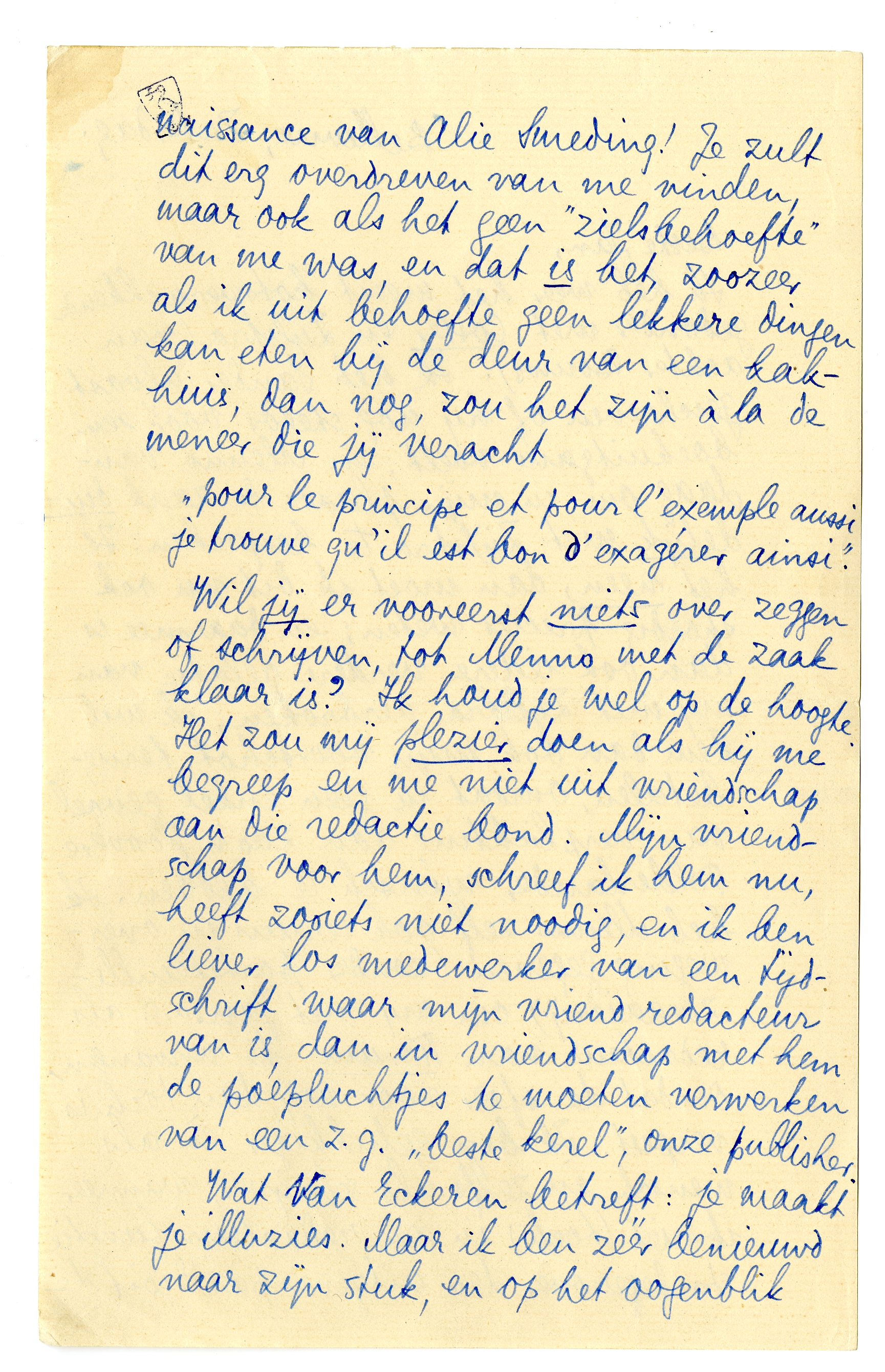 Ik heb weer het meest kotsverwekkende gedonder met Coster en Zijlstra (van achter Bouws). Ik heb Sander alvast geschreven of hij nog steeds voor een boekuitgave voelt; en Menno vandaag om in mijn plaats de zaak duidelijk met Zijlstra te bespreken. Is het neen, dan moet ik dit nu ook spoedig precies weten; en daarmee is dan ook iedere verdere relatie van mij met Zijlstra verbroken; ik wil hem dan ook mijn voorschot terugbetalen, omdat ik geen enkel gevoel van verplichting aan zoo'n poovere Polderlander wensch te hebben. Ik heb Menno zelf ook serieus in overweging gegeven (zonder portefeuille-zwaaierij) om mij met Jan. a.s. als redacteur van Forum te vervangen, omdat de sfeer voor mij dan toch is verpest. Ik ben gelukkiger èn als mensch èn zelfs als schrijver, wanneer ik niet (toch) in een redacteursfunctie sta tegenover den uitgever par droit de naissance van Alie Smeding! Je zult dit erg overdreven van me vinden, maar ook als het geen ‘zielsbehoefte’ van me was, en dat is het, zoozeer als ik uit behoefte geen lekkere dingen kan eten bij de deur van een kakhuis, dan nog, zou het zijn à la de meneer die jij veracht