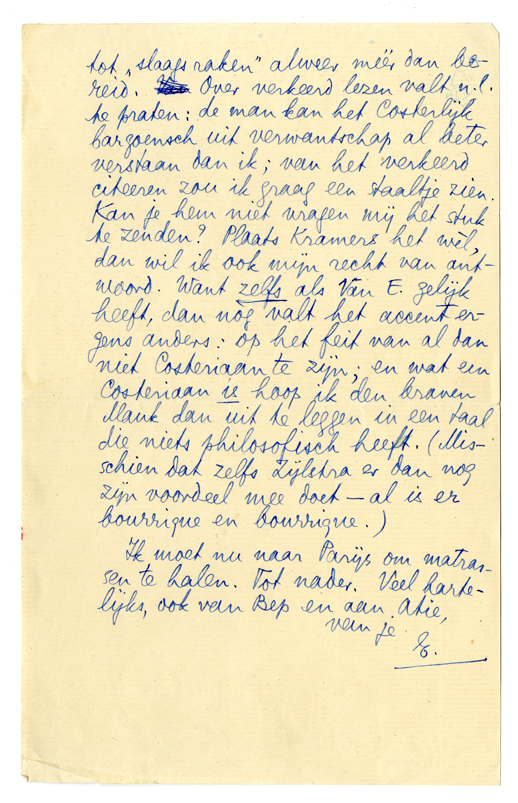 Wat Van Eckeren betreft: je maakt je illuzies. Maar ik ben zéér benieuwd naar zijn stuk, en op het oogenblik tot ‘slaags raken’ alweer méér dan bereid. Over verkeerd lezen valt n.l. te praten: de man kan het Costerlijk bargoensch uit verwantschap al beter verstaan dan ik; van het verkeerd citeeren zou ik graag een staaltje zien. Kan je hem niet vragen mij het stuk2338 te zenden? Plaats Kramers het wèl, dan wil ik ook mijn recht van antwoord. Want zelfs als Van E. gelijk heeft, dan nòg valt het accent ergens anders: op het feit van al dan niet Costeriaan te zijn; en wat een Costeriaan is hoop ik den braven Mauk dan uit te leggen in een taal die niets philosofisch heeft. (Misschien dat zelfs Zijlstra er dan nog zijn voordeel mee doet - al is er bourrique en bourrique.)