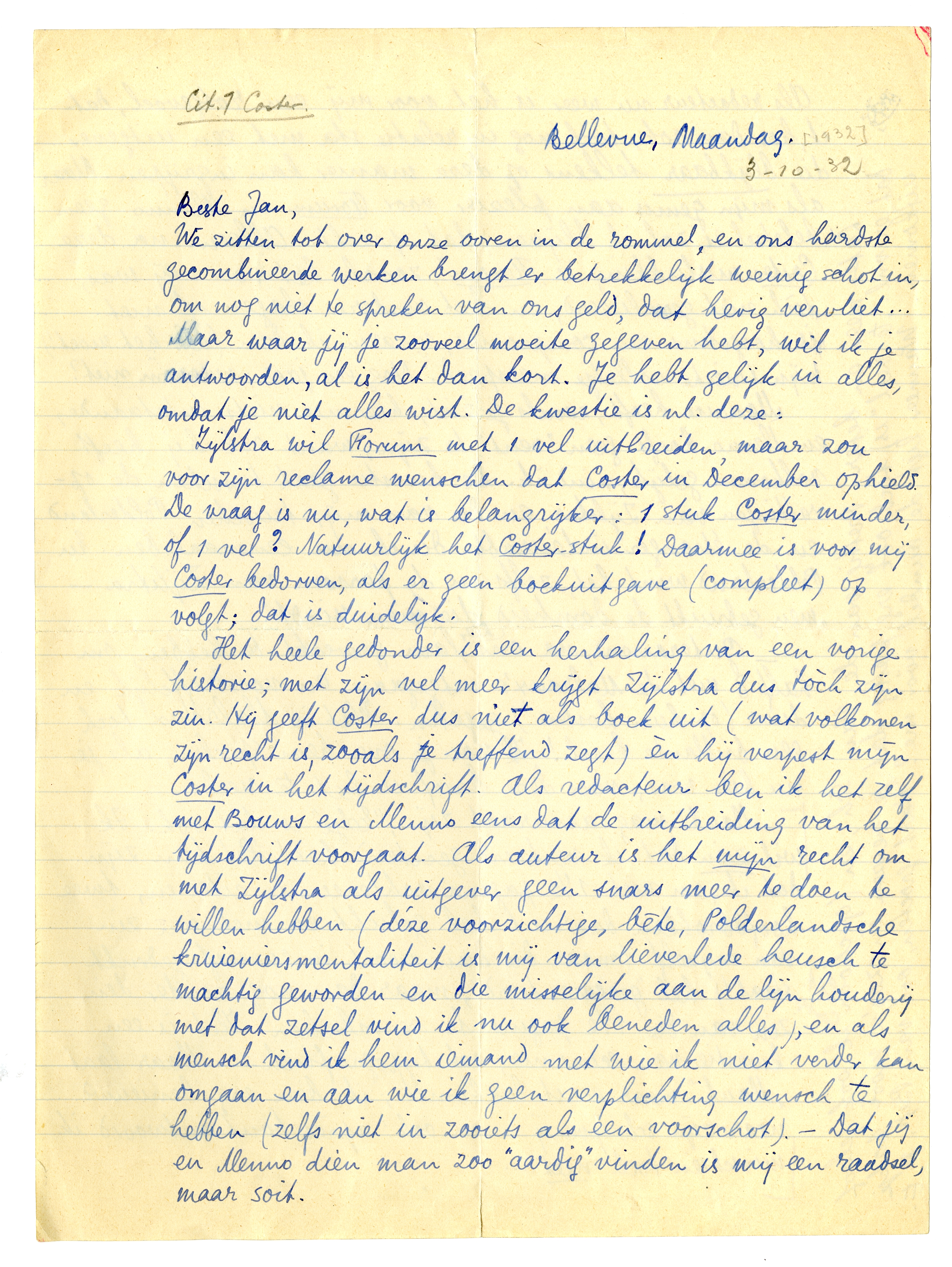 Het heele gedonder is een herhaling van een vorige historie; met zijn vel meer krijgt Zijlstra dus tòch zijn zin. Hij geeft Coster dus niet als boek uit (wat volkomen zijn recht is, zooals je treffend zegt) èn hij verpest mijn Coster in het tijdschrift. Als redacteur ben ik het zelf met Bouws en Menno eens dat de uitbreiding van het tijdschrift voorgaat. Als auteur is het mijn recht om met Zijlstra als uitgever geen snars meer te doen te willen hebben (déze voorzichtige, bête, Polderlandsche kruieniersmentaliteit is mij van lieverlede heusch te machtig geworden en die misselijke aan de lijn houderij met dat zetsel vind ik nu ook beneden alles), en als mensch vind ik hem iemand met wie ik niet verder kan omgaan en aan wie ik geen verplichting wensch te hebben (zelfs niet in zooiets als een voorschot). - Dat jij en Menno dien man zoo ‘aardig’ vinden is mij een raadsel, maar soit.