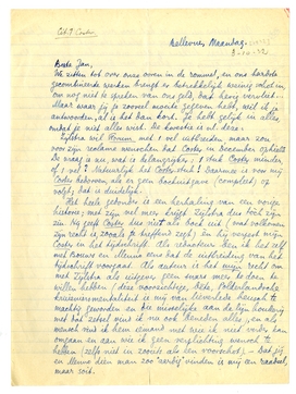 Later meer en beter. Prettig van de Van Sch., en (ofschoon ik ook geloof dat er vnl. ‘te veel’ is) toch ook erg prettig dat je verzen in zoo'n mooi pakje uitkomen. Wanneer ligt de bundel vóór me? Hart. groeten, ook van Bep, je