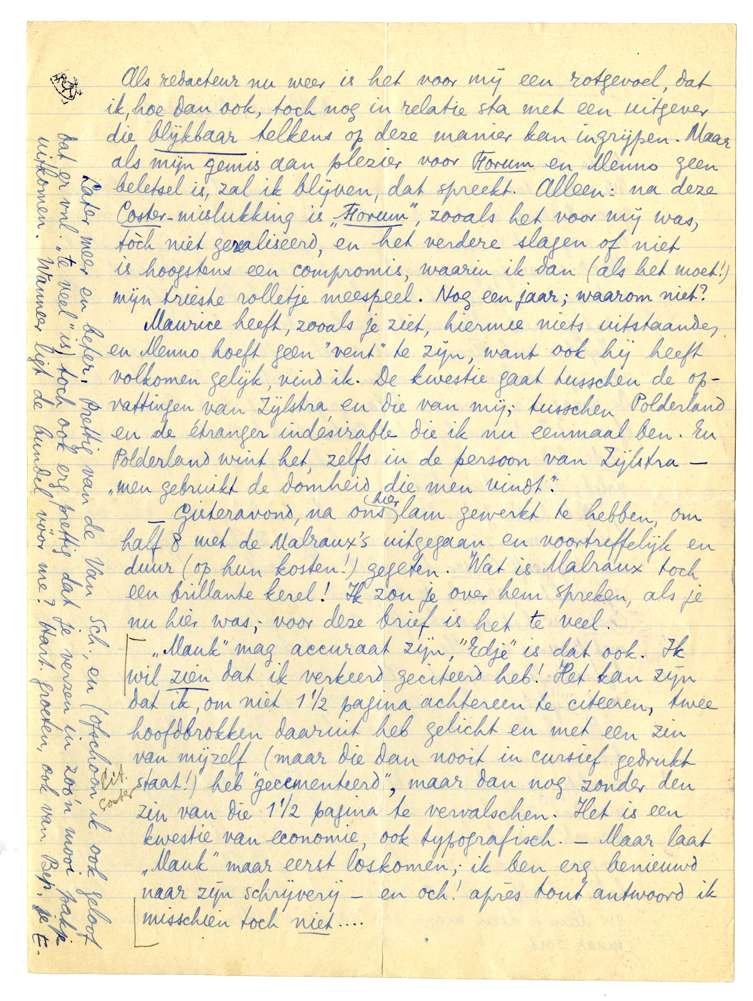 Als redacteur nu weer is het voor mij een rotgevoel, dat ik, hoe dan ook, toch nog in relatie sta met een uitgever die blijkbaar telkens op deze manier kan ingrijpen. Maar als mijn gemis aan plezier voor Forum en Menno geen beletsel is, zal ik blijven, dat spreekt. Alleen: na deze Cosfer-mislukking is ‘Forum’, zooals het voor mij was, tòch niet gerealiseerd, en het verdere slagen of niet is hoogstens een compromis, waarin ik dan (als het moet!) mijn trieste rolletje meespeel. Nog een jaar; waarom niet?