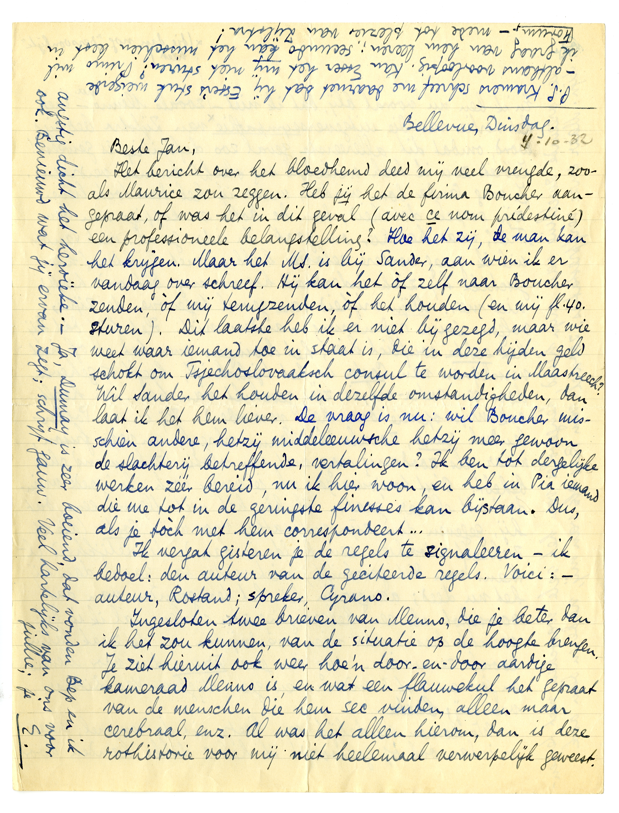 Het bericht over het bloedhemd2339 deed mij veel vreugde, zooals Maurice zou zeggen. Heb jij het de firma Boucher aangepraat, of was het in dit geval (avec ce nom prédestiné) een professioneele belangstelling? Hoe het zij, de man kan het krijgen. Maar het MS. is bij Sander, aan wien ik er vandaag over schreef. Hij kan het òf zelf naar Boucher zenden, òf mij terugzenden, òf het houden (en mij fl.40. sturen). Dit laatste heb ik er niet bij gezegd, maar wie weet waar iemand toe in staat is, die in deze tijden geld schokt om Tsjechoslovaaksch consul te worden in Maastreech? Wil Sander het houden in dezelfde omstandigheden, dan laat ik het hem liever. De vraag is nu: wil Boucher misschien andere, hetzij middeleeuwsche hetzij meer gewoon de slachterij betreffende, vertalingen? Ik ben tot dergelijke werken zéér bereid, nu ik hier woon, en heb in Pia iemand die me tot in de geringste finesses kan bijstaan. Dus, als je tòch met hem correspondeert...