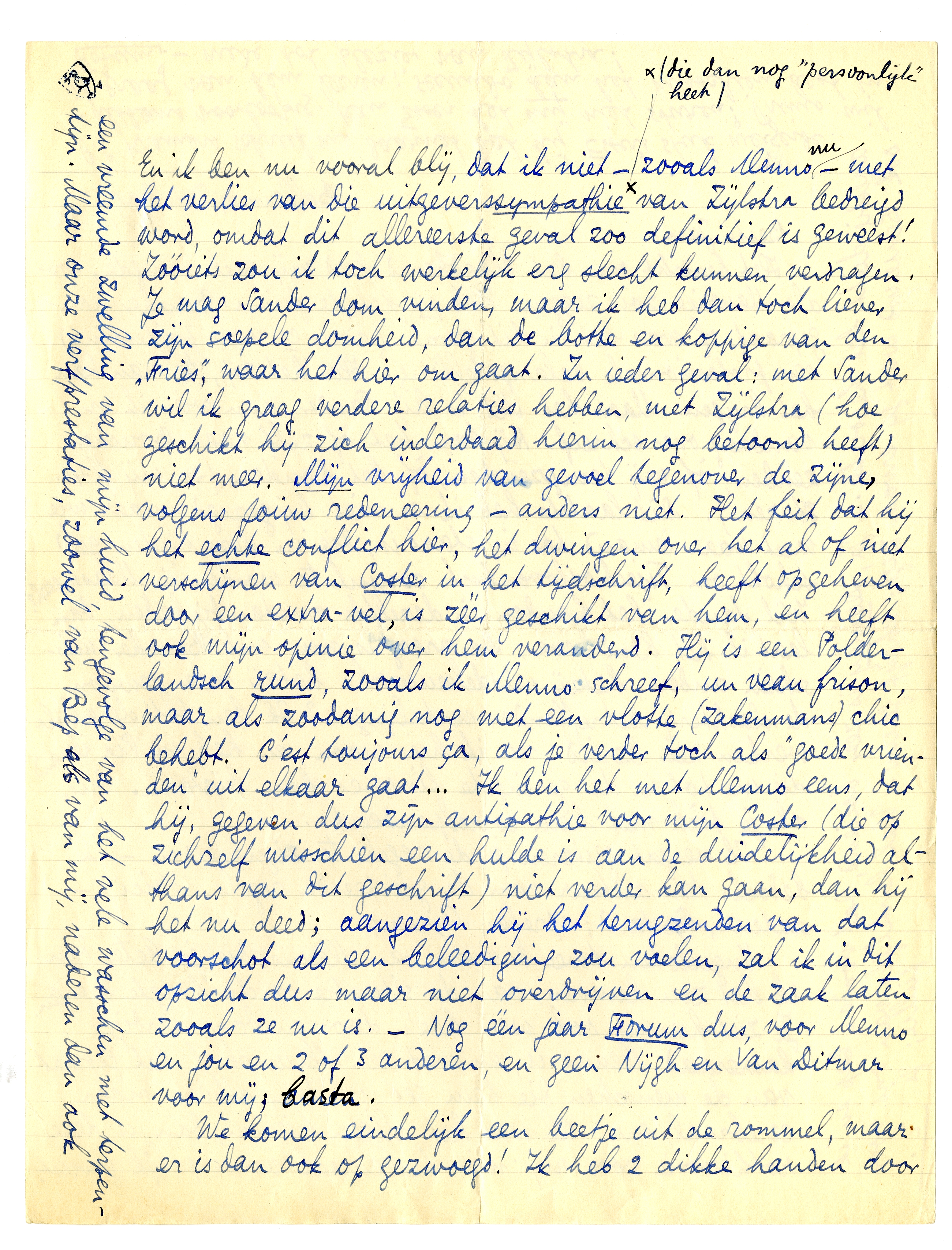 Ingesloten twee brieven van Menno,2340 die je beter dan ik het zou kunnen, van de situatie op de hoogte brengen. Je ziet hieruit ook weer hoe'n door-en-door aardige kameraad Menno is, en wat een flauwekul het gepraat van de menschen die hem sec vinden, alleen maar cerebraal, enz. Al was het alleen hierom, dan is deze rothistorie voor mij niet heelemaal verwerpelijk geweest. En ik ben nu vooral blij, dat ik niet - zooals Menno nu - met het verlies van die uitgeverssympathie* van Zijlstra bedreigd word, omdat dit allereerste geval zoo definitief is geweest! Zóóiets zou ik toch werkelijk erg slecht kunnen verdragen. Je mag Sander dom vinden, maar ik heb dan toch liever zijn soepele domheid, dan de botte en koppige van den ‘Fries’, waar het hier om gaat. In ieder geval: met Sander wil ik graag verdere relaties hebben, met Zijlstra (hoe geschikt hij zich inderdaad hierin nog betoond heeft) niet meer. Mijn vrijheid van gevoel te-genover de zijne, volgens jouw redeneering - anders niet. Het feit dat hij het echte conflict hier, het dwingen over het al of niet verschijnen van Coster in het tijdschrift, heeft opgeheven door een extra-vel, is zéér geschikt van hem, en heeft ook mijn opinie over hem veranderd. Hij is een Polderlandsch rund, zooals ik Menno schreef, un veau frison, maar als zoodanig nog met een vlotte (zakenmans) chic behebt. C'est toujours ça, als je verder toch als ‘goede vrienden’ uit elkaar gaat... Ik ben het met Menno eens, dat hij, gegeven dus zijn antipathie voor mijn Coster (die op zichzelf misschien een hulde is aan de duidelijkheid althans van dit geschrift) niet verder kan gaan, dan hij het nu deed; aangezien hij het terugzenden van dat voorschot als een beleediging zou voelen, zal ik in dit opzicht dus maar niet overdrijven en de zaak laten zooals ze nu is. - Nog één jaar Forum dus, voor Menno en jou en 2 of 3 anderen, en geen Nijgh en Van Ditmar voor mij; basta.