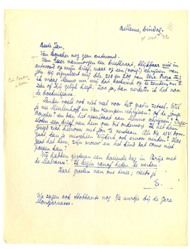 Sander voelt ook niet veel voor het gratis zetsel. Wil je nu Meulenhoff en Van Kampen schrijven? of de jonge Boucher? en dan het resultaat aan Menno schrijven? Ingesloten een brief van hem over dit onderwerp. Ik heb hem gezegd zich hierover met jou te verstaan. Als die N.V.2344 doorgaat, kan je misschien Nijkerk ook ervoor vinden? Hoe gaat het hem, zijn vrouw en het kind dat soms niet poepen kan?