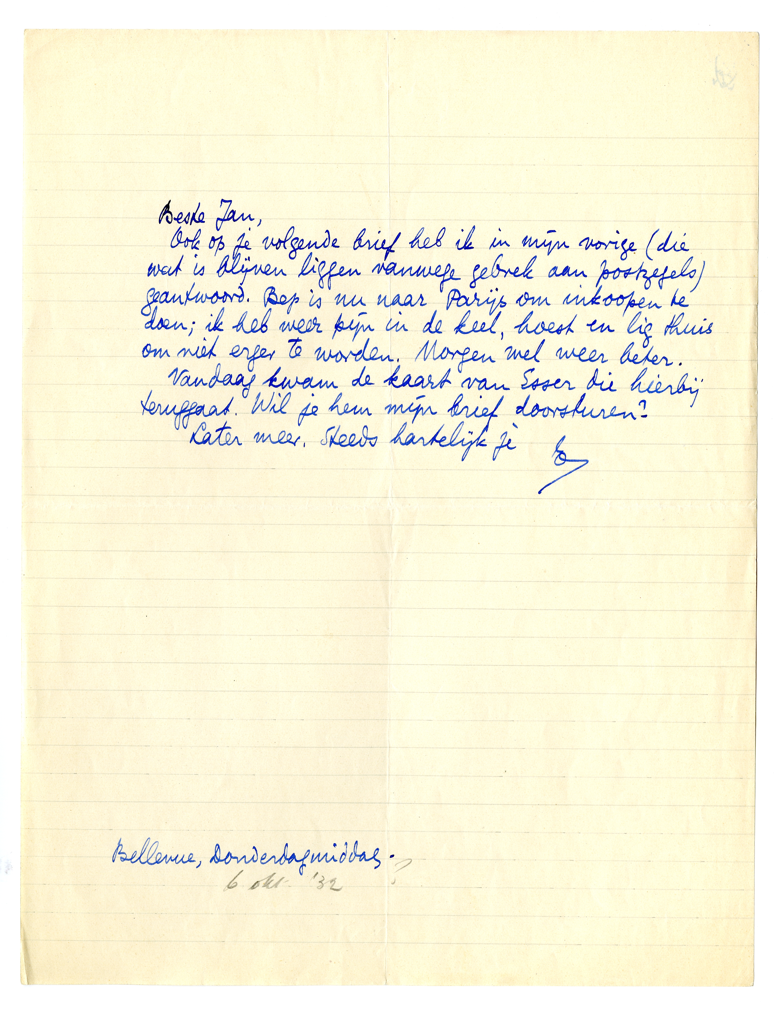 Ook op je volgende brief heb ik in mijn vorige (die wat is blijven liggen vanwege gebrek aan postzegels) geantwoord. Bep is nu naar Parijs om inkoopen te doen; ik heb weer pijn in de keel, hoest en lig thuis om niet erger te worden. Morgen wel weer beter.