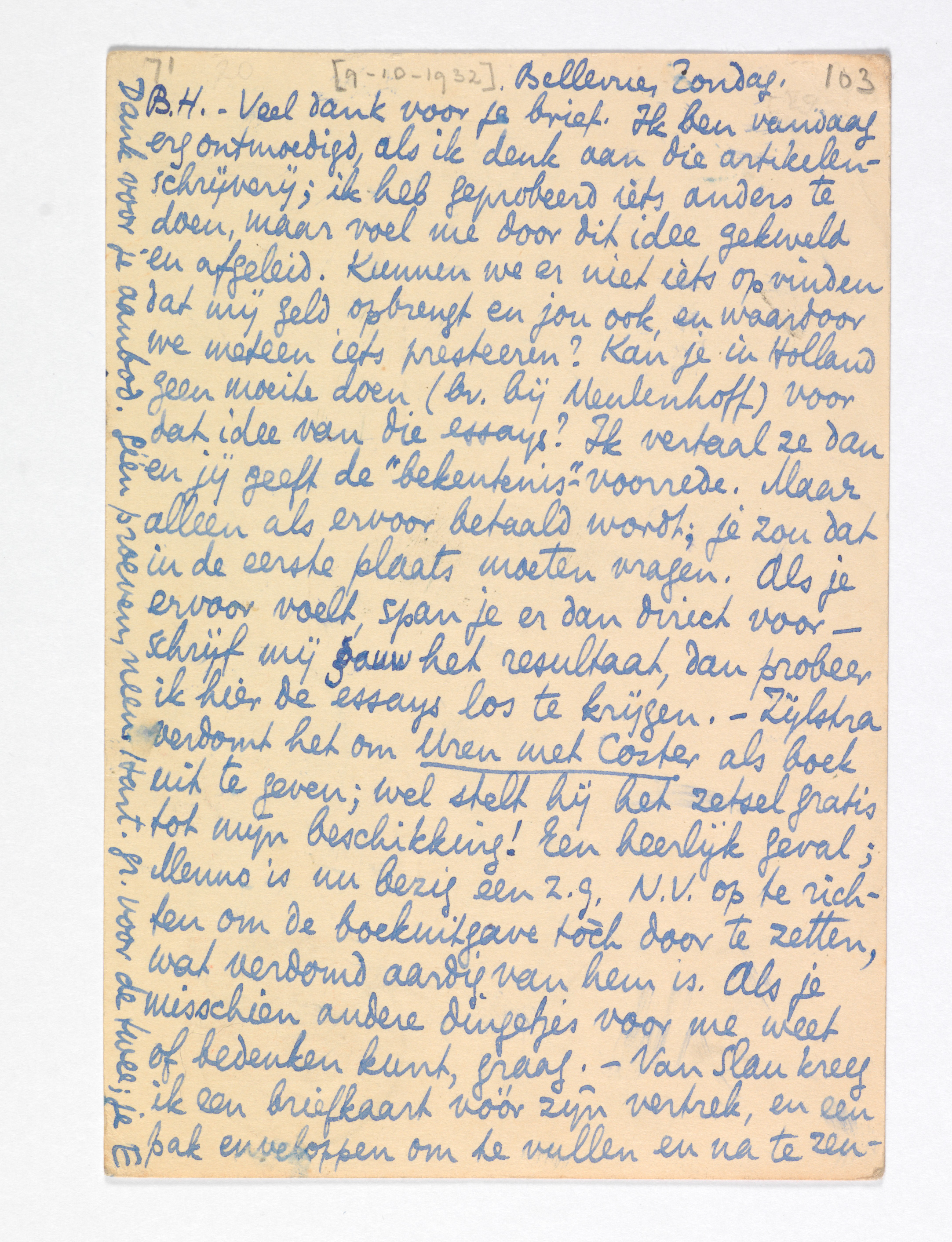 B.H. - Veel dank voor je brief. Ik ben vandaag erg ontmoedigd, als ik denk aan die artikelenschrijverij; ik heb geprobeerd iets anders te doen, maar voel me door dit idee gekweld en afgeleid. Kunnen we er niet iets op vinden dat mij geld opbrengt en jou ook, en waardoor we meteen iets presteeren? Kan je in Holland geen moeite doen (bv. bij Meulenhoff) voor dat idee van die essays?2352 Ik vertaal ze dan en jij geeft de ‘bekentenis’-voorrede. Maar alleen als ervoor betaald wordt; je zou dat in de eerste plaats moeten vragen. Als je ervoor voelt, span je er dan direct voor - schrijf mij gauw het resultaat, dan probeer ik hier de essays los te krijgen. - Zijlstra verdomt het om Uren met Coster als boek uit te geven; wel stelt hij het zetsel gratis tot mijn beschikking! Een heerlijk geval; Menno is nu bezig een z.g. N.V. op te richten om de boekuitgave tòch door te zetten, wat verdomd aardig van hem is. Als je misschien andere dingetjes voor me weet of bedenken kunt, graag. - Van Slau kreeg ik een briefkaart vóór zijn vertrek, en een pak enveloppen om te vullen en na te zenden. Arme kerel toch. En ik hèb geen tijd - en geen lust - en geen ‘vitaliteit’ meer voor brieven; ik voel dat het nu een ‘erop of eronder’ wordt voor andere dingen. Dit jaar in Bellevue gaat definitief voor me worden, dat zal je zien. - Jammer dat je Mikro niet zoo aardig vond; enfin, scheur dan de heele Vermoeide Jeugd eruit, dan heb je Parlando + een paar verzen die je wel niet zullen hinderen, en in verbeterde lezing (soms belangrijk verbeterd!) - De Opvolgster2353 van Vestdijk is toch uitstekend; maar je moet weten dat het voor de ‘ik’ gaat tusschen moeder en vrouw. Herlees het nu. Dank voor je aanbod. Géén proeven, neen! Hart. gr. voor de twee;