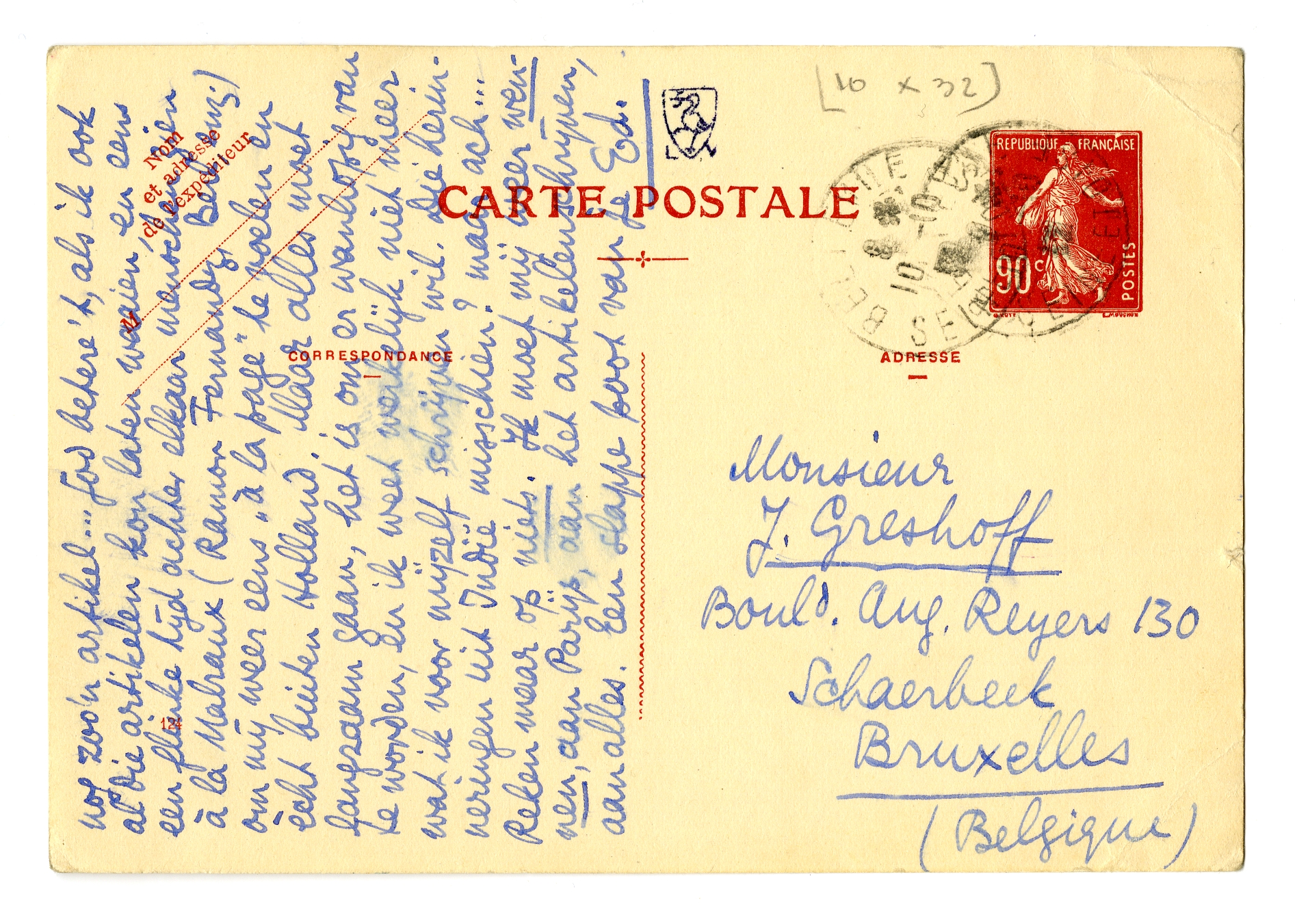 Beste Jan, Ik ben straal ontmoedigd en geloof vandaag dat ik tot niets meer kom! - dat ik geen talent heb niet alleen, maar ook nooit meer de tijd zal vinden om te doen wat ik doen wil. Ik had een reuzenboek op het oog, waarin ik van alles wou zetten: verhalen, anecdoten, herinneringen, aphorismen, dagboekbladen. Ik zei je dat ik er 12 blzn. van klaar had. En verscheidene aanteekeningen uit mijn eerste tijd hier. En vandaag... foetsji! alles zakt onder me weg. Malraux is hier gisteren geweest, we hebben den heelen middag gesproken, en ik heb het gevoel dat ik niets weet, dat alles wat ik te zeggen heb zonder beteekenis is, altijd op een inferieur plan zal blijven; dat ik nog duizenden dingen te lezen heb: Proud'hon en Nietzsche en Dostojevsky en nog eens heelemaal Shakespeare en Stendhal - en dat ik nooit meer de tijd zal vinden ervoor; dat ik niet eens meer weet hoe ik Larbaud in zijn geheel zal kunnen overlezen, voor dat artikel voor De Gids.2354 Ik zal nu maar een artikel schrijven over detective-verhalen van ‘intellectueelen’ (naar aanl. van Aveline) en dan nog zoo'n artikel... God betere't, als ik ook al die artikelen kon laten waaien, en eens een flinke tijd achter elkaar menschen zien à la Malraux (Ramon Fernandez, Berl, enz.) om mij weer eens ‘à la page’ te voelen en ècht buiten Holland. Maar alles moet langzaam gaan, het is om er wanhopig van te worden, en ik weet werkelijk niet meer wat ik voor mijzelf schrijven wil. Die herinneringen uit Indië misschien? maar ach... Reken maar op niets. Ik moet mij weer wennen, aan Parijs, aan het artikelenschrijven, aan alles. Een slappe poot van je
