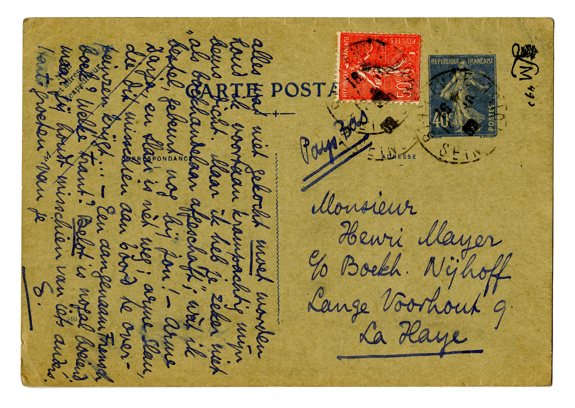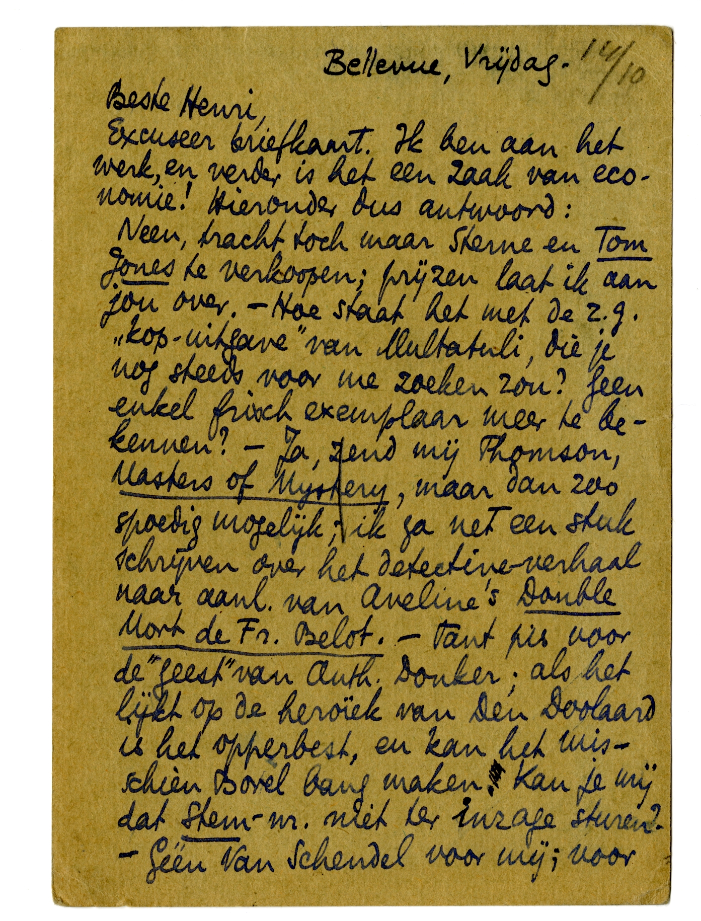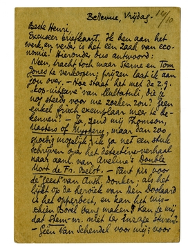 Neen, tracht toch maar Sterne en Tom Jones te verkoopen; prijzen laat ik aan jou over. - Hoe staat het met de z.g. ‘kop-uitgave’ van Multatuli, die je nog steeds voor me zoeken zou? Geen enkel frisch exemplaar meer te bekennen? - Ja, zend mij Thomson, Masters of Mystery,2357 maar dan zoo spoedig mogelijk; ik ga net een stuk schrijven over het detective-verhaal naar aanl. van Aveline's Double Mort de Fr. Belot. - Tant pis voor de ‘geest’ van Anth. Donker2358; als het lijkt op de heroïek van Den Doolaard is het opperbest, en kan het misschien Borel bang maken. Kan je mij dat Stem-nr. niet ter inzage sturen? - Géén Van Schendel voor mij2359; voor alles wat niet gekocht moet worden houd ik voortaan krampachtig mijn beurs dicht. Maar ik heb je zeker niet ‘als boekhandelaar afgeschaft’; wàt ik bestel, gebeurt nog bij jou! - Arme Darja, en Slau is nèt weg; arme Slau, die dit misschien aan boord te overpeinzen krijgt...2360 - Een aangenaam Fransch boek? Welke trant? Belot is nogal boeiend, maar jij houdt misschien van iets anders. Hart. groeten van je