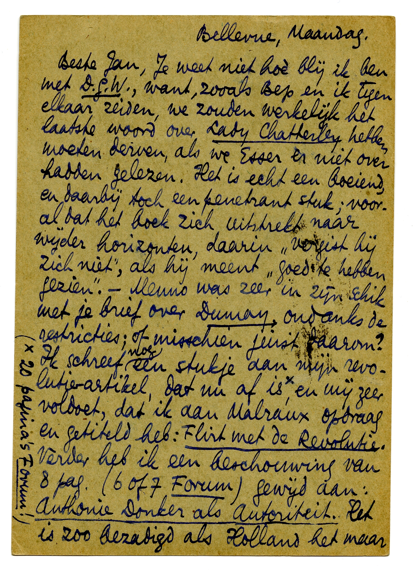 Beste Jan, Je weet niet hoè blij ik ben met D.G.W., want, zooals Bep en ik tegen elkaar zeiden, we zouden werkelijk het laatste woord over Lady Chatterley2371 hebben moeten derven, als we Esser er niet over hadden gelezen. Het is echt een boeiend, en daarbij toch een penetrant stuk; vooral dat het boek zich uitstrekt naar wijder horizonten, daarin ‘vergist hij zich niet’, als hij meent ‘goed te hebben gezien’. - Menno was zeer in zijn schik met je brief over Dumay, ondanks de restricties; of misschien juist daarom? Ik schreef nog een stukje aan mijn revolutie-artikel, dat nu af is,* en mij zeer voldoet, dat ik aan Malraux opdraag en getiteld heb: Flirt met de Revolutie. Verder heb ik een beschouwing van 8 pag. (6 of 7 Forum) gewijd aan: Anthonie Donker als Autoriteit. Het is zoo bezadigd als Holland het maar wenschen kan en ik zweer je dat hij het niet leuk zal vinden. Ik lees op het oogenblik een boek over Belle van Zuylen2372 - een ellendig boek, op de citaten na, maar een alleraardigste vrouw; met Marie Bashkirtseff2373 misschien wel de aardigste die ik op papier ken - heel wat anders dan die fameuze Colette! Schrijf eens, als je terug bent, ook over wat je in Holland zag en deed. Hart. groeten van ons 2, steeds je