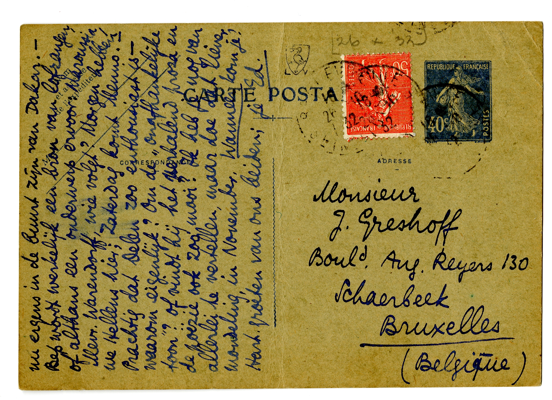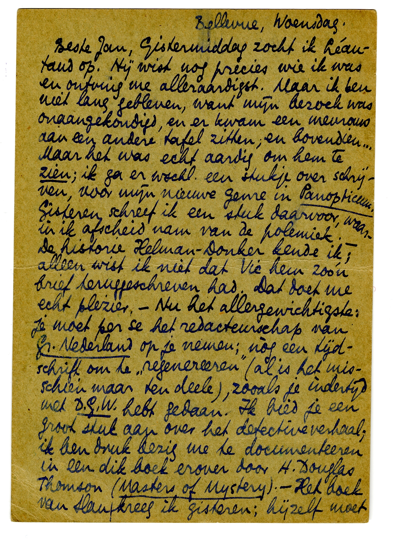Beste Jan, Gistermiddag zocht ik Léautaud op. Hij wist nog precies wie ik was en ontving me alleraardigst. Maar ik ben niet lang gebleven, want mijn bezoek was onaangekondigd, en er kwam een mevrouw aan een andere tafel zitten, en bovendien... Maar het was echt aardig om hem te zien; ik ga er wschl. een stukje over schrijven, voor mijn nieuwe genre in Panopticum. Gisteren schreef ik een stuk daarvoor, waarin ik afscheid nam van de polemiek. - De historie Helman-Donker2375 kende ik; alleen wist ik niet dat Vic hem zoo'n brief teruggeschreven had. Dat doet me echt plezier. - Nu het allergewichtigste: je moet per se het redacteurschap van Gr. Nederland op je nemen; nòg een tijdschrift om te ‘regenereeren’ (al is het misschien maar ten deele), zooals je indertijd met D.G.W. hebt gedaan. Ik bied je een groot stuk aan over het detectiveverhaal; ik ben druk bezig me te documenteeren in een dik boek erover door H. Douglas Thomson (Masters of Mystery). - Het boek van Slau2376 kreeg ik gisteren; hijzelf moet nu ergens in de buurt zijn van Dakar. - Bep wordt werkelijk een bron van lofzangen, of althans een onderwerp ervoor: Maroussia, Mevr. Warendorff, wie volgt? Morgen hebben we Hellens hier; Zaterdag komt Menno. - Prachtig dat Delen zoo enthousiast is - waarom eigenlijk? Om de ‘onafhankelijke toon’? of vindt hij het verhalend proza en de poëzie ook zoo mooi? Ik heb je nog van allerlei te vertellen, maar doe dat liever mondeling, in November. Wanneer kom je? Hart. groeten van ons beiden;