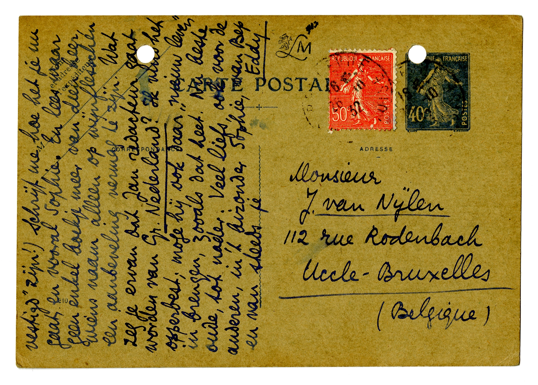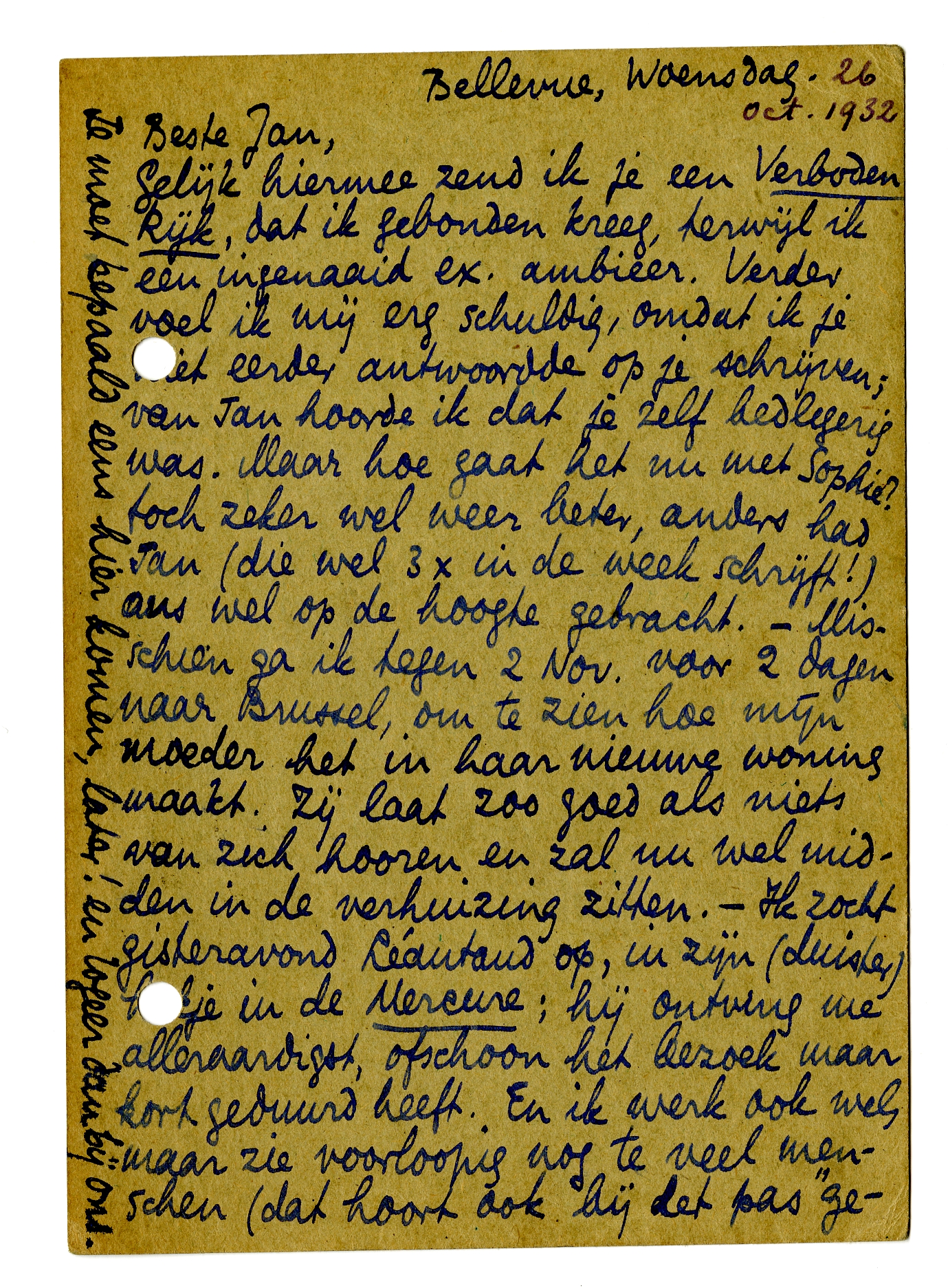 Gelijk hiermee zend ik je een Verboden Rijk, dat ik gebonden kreeg, terwijl ik een ingenaaid ex. ambieer. Verder voel ik mij erg schuldig, omdat ik je niet eerder antwoordde op je schrijven; van Jan hoorde ik dat je zelf bedlegerig was. Maar hoe gaat het nu met Sophie? toch zeker wel weer beter, anders had Jan (die wel 3 × in de week schrijft!) ons wel op de hoogte gebracht. - Misschien ga ik tegen 2 Nov. voor 2 dagen naar Brussel, om te zien hoe mijn moeder het in haar nieuwe woning maakt. Zij laat zoo goed als niets van zich hooren en zal nu wel midden in de verhuizing zitten. - Ik zocht gisteravond Léautaud op, in zijn (duister) hokje in de Mercure; hij ontving me alleraardigst, ofschoon het bezoek maar kort geduurd heeft. En ik werk ook wel, maar zie voorloopig nog te veel menschen (dat hoort ook bij het pas ‘gevestigd’ zijn!) Schrijf me hoe het je nu gaat, en vooral Sophie. En lees maar geen enkel boekje meer van dien heer, wiens naam alleen op wijnflesschen een aanbeveling vermag te zijn.2377 Wat zeg je ervan dat Jan redacteur gaat worden van Gr. Nederland? Ik vind het opperbest; moge hij ook daar ‘nieuw leven’ in brengen, zooals dat heet. Nu beste oude, tot nader. Veel liefs, ook voor de anderen, in 't bizonder Sophie, van Bep en van steeds je