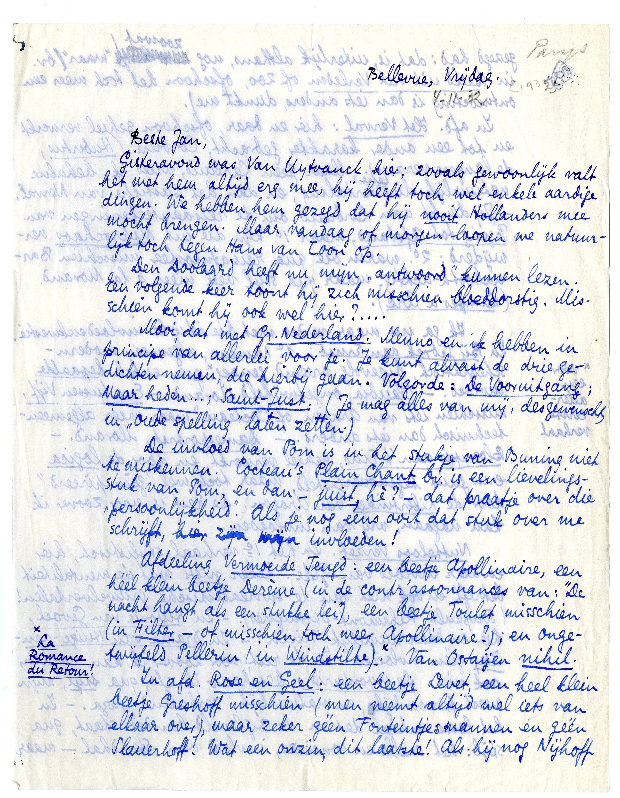 Ik ga nu maar verder met die idiote invloedenkwestie. In Bij Gebrek aan Ernst: 1e Nameno, algemeen modern - schematisch, bijgevolg, vreemd genoeg,* geen enkele bepaalde invloed. - Claudia, ongetwijfeld Morand. - Een tussen Vijf, misschien iets van Aragon, of Cocteau? maar meer algemeen-technisch dan iets anders. - Damesportret, Morand. - Bloempje aan 't Eind, geheel verwerkt, en door de logica eruit juist tegenovergesteld, maar toch wel ‘geïnspireerd’ door de Libertinage van Aragon. De rest is, voor zoover ik kan nagaan, vrij van invloeden.