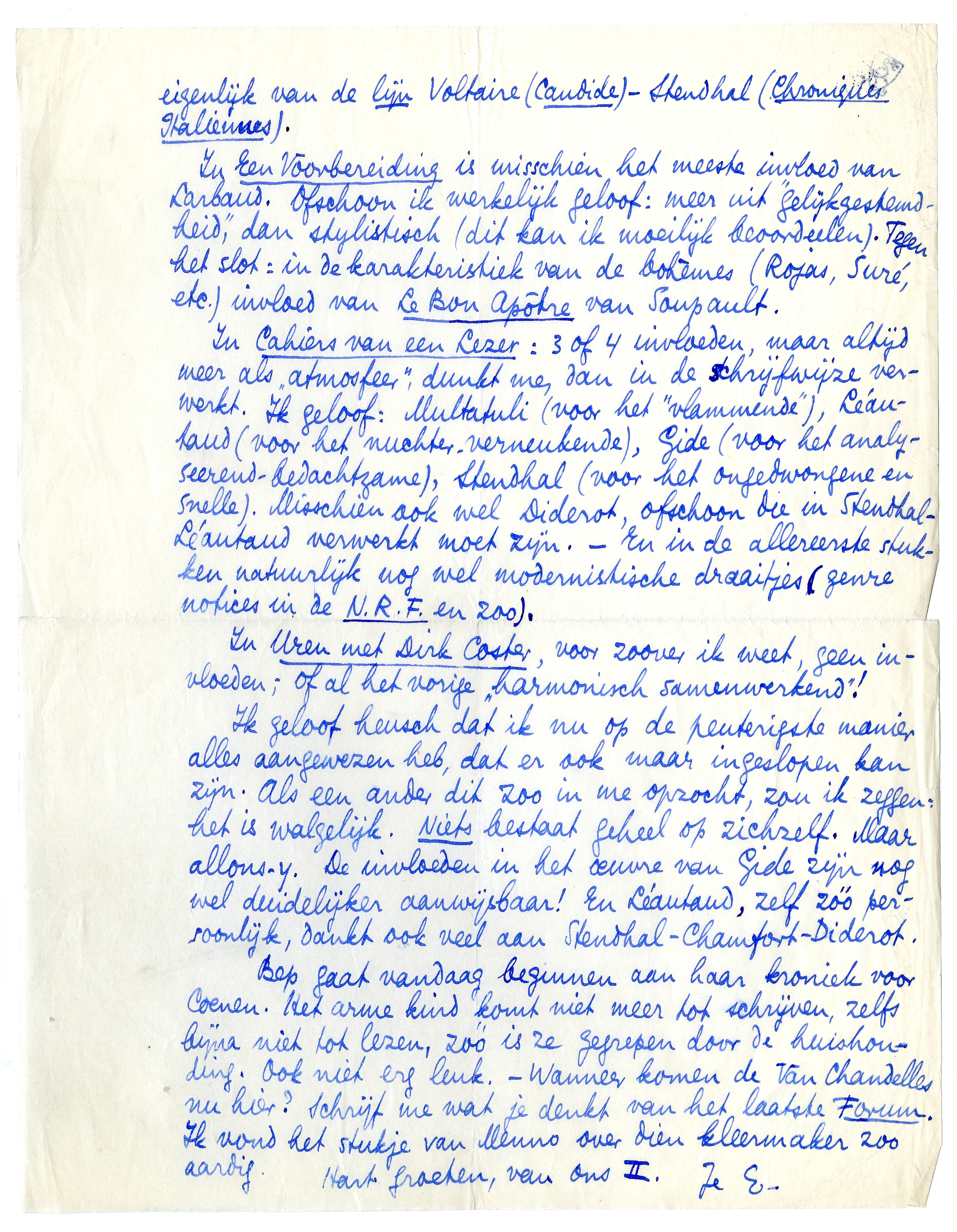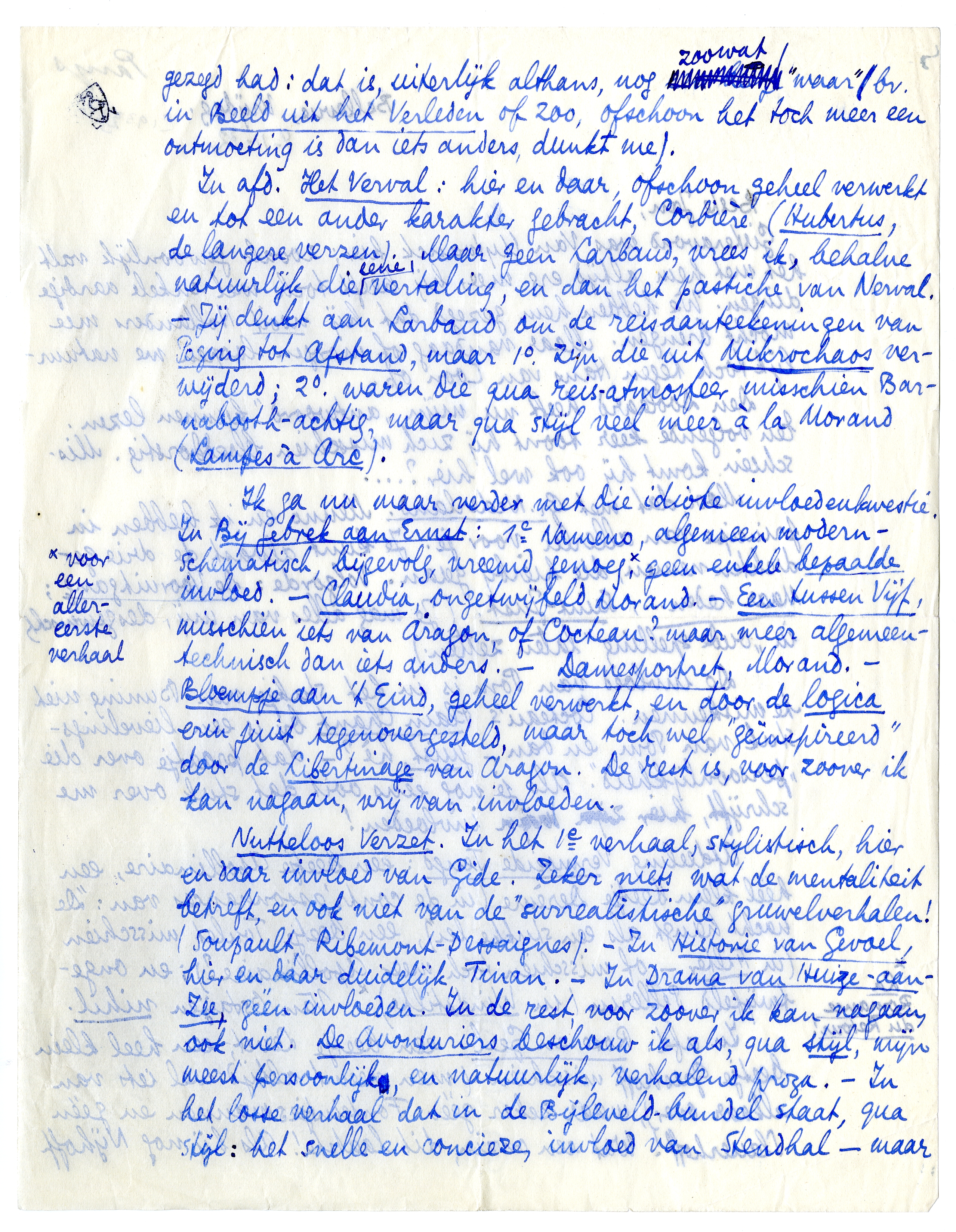 Nutteloos Verzet. In het 1e verhaal, stylistisch, hier en daar invloed van Gide. Zeker niets wat de mentaltiteit betreft, en ook niet van de ‘surrealistische’ gruwelverhalen! (Soupault, Ribemont-Dessaignes). - In Historie van Gevoel, hier en daar duidelijk Tinan. - In Drama van Huize-aan-Zee, géén invloeden. In de rest, voor zoover ik kan nagaan, ook niet. De Avonturiers beschouw ik als, qua stijl, mijn meest persoonlijk, en natuurlijk, verhalend proza. - In het losse verhaal dat in de Bijleveld-bundel staat, qua stijl: het snelle en concieze, invloed van Stendhal - maar eigenlijk van de lijn Voltaire (Candide) - Stendhal (Chroniques Italiennes).