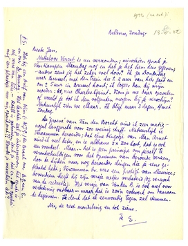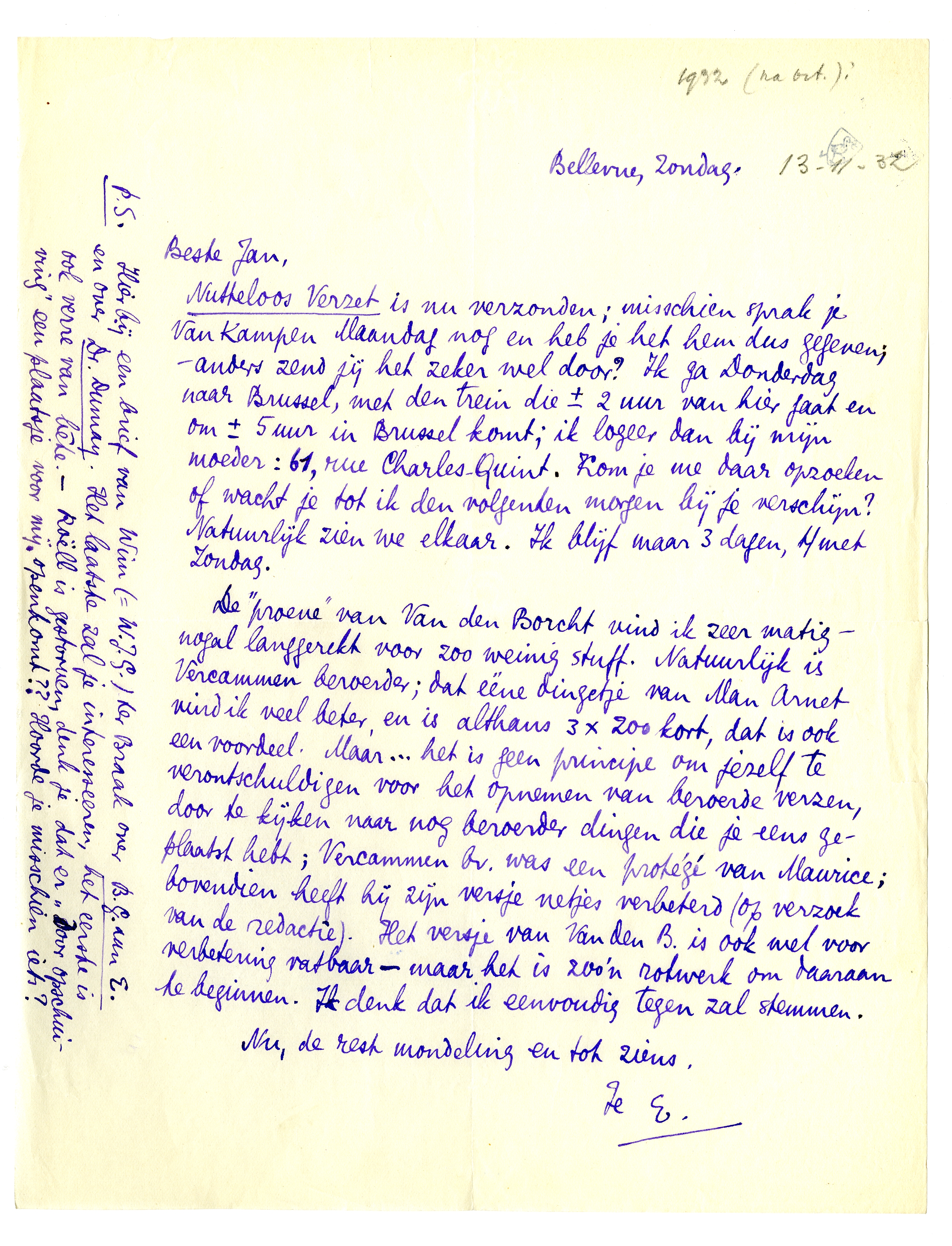 Nutteloos Verzet is nu verzonden; misschien sprak je Van Kampen Maandag nog en heb je het hem dus gegeven; - anders zend jij het zeker wel door? Ik ga Donderdag naar Brussel, met den trein die ± 2 uur van hier gaat en om ± 5 uur in Brussel komt; ik logeer dan bij mijn moeder: 61, rue Charles-Quint. Kom je me daar opzoeken of wacht je tot ik den volgenden morgen bij je verschijn? Natuurlijk zien we elkaar. Ik blijf maar 3 dagen, t/met Zondag.