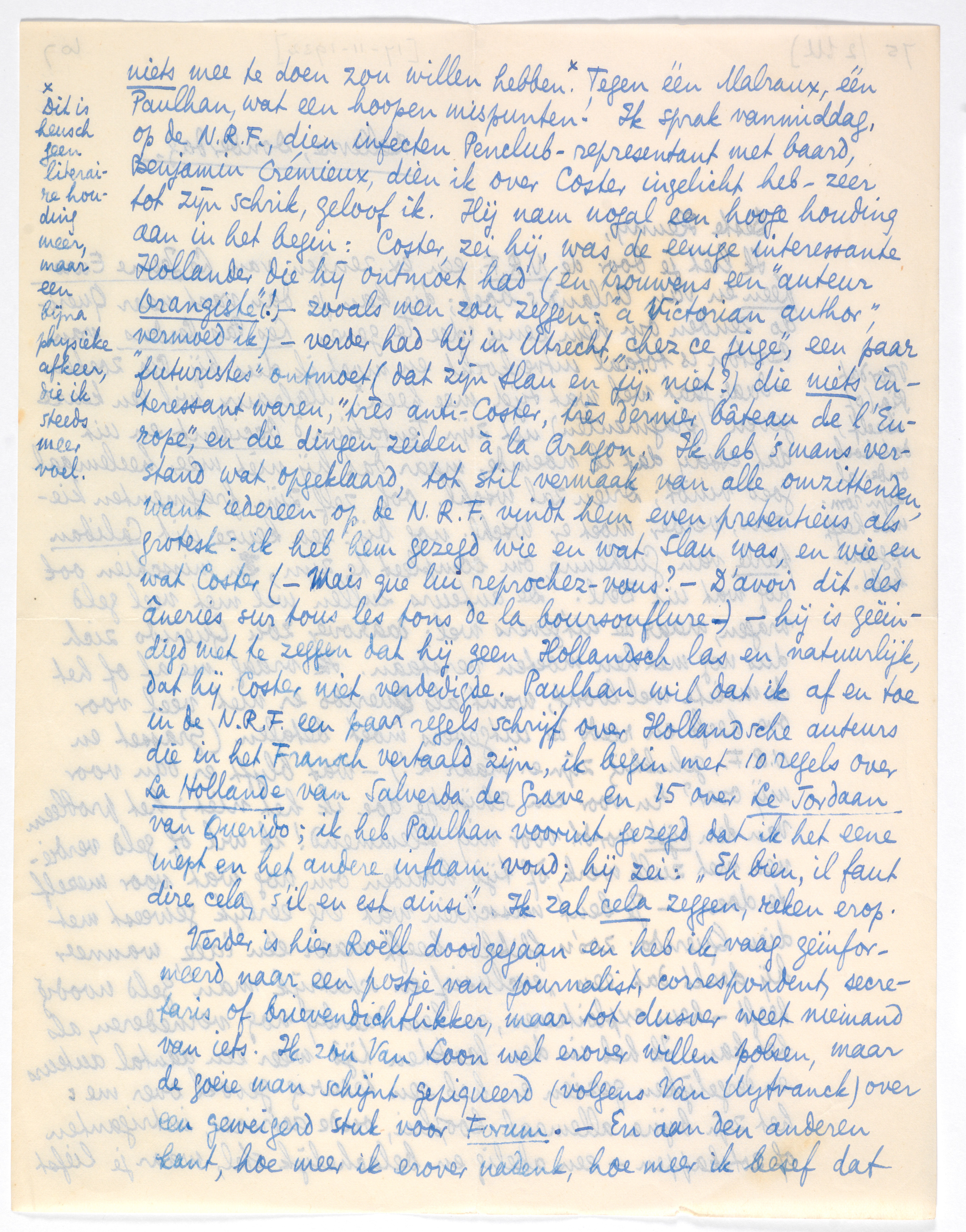 Ik liet je door de N.R.F. een ex. zenden van Le Jeune Européen en van Arland's boek2411; die kan je dan vast naar Querido zenden om hem eenig idee te geven. Les Pas Perdus van Breton is totaal uitverkocht en moet ik dus bij Pia zoeken - daar gaat wel wat tijd mee heen.* Malraux wil een keuze geven (fragmenten) uit zijn Tentation d'Occident en uit dat essay dat ik noemde, maar dat hij niet meer heelemaal goed vindt; Drieu zal wschl. ook zelf zijn fragmenten kiezen; verder moet er wschl. nog bij: een keuze uit Caliban parle van Guéhenno, om compleet te zijn, en misschien ook nog wat uit Berl. De auteurs zullen wel niet veel geld vragen; maar de uitgevers wel; daarover zou Querido zich dus nog met hen moeten verstaan. Ik vraag me af of het de moeite wel loont, want als Querido er niet veel voor over heeft en reeds de uitgevers moet betalen (Grasset en N.R.F., gelukkig zijn er maar 2!) - wat blijft er dan voor mij over? En voor een schijntje doe ik het niet; het probleem van den tijd wordt voor mij klemmend! ik wil òf geld verdienen met zulk werk, òf tijd houden om nog wat voor mezelf te doen. - Je bent misschien wat erg eerlijk geweest met dien Querido: zoo'n flikker heeft maar één idee, wanneer hij denkt dat een ‘exclusief en schatrijk man’ geld noodig heeft - hem exploiteeren, en hem daarbij nog vernederen, als het kan. Ik heb in den laatsten tijd weer een aantal auteurs en dergelijken gezien en heb een treurig gevoel over me: het zijn bijna allemaal kooplui, oude actrices, intriganten of zotskappen - een akelig en belachelijk stel, waar je liefst niets mee te doen zou willen hebben.2412 Tegen één Malraux, één Paulhan, wat een hoopen mispunten! Ik sprak vanmiddag, op de N.R.F., dien infecten Penclub-representant met baard, Benjamin Crémieux, dien ik over Coster ingelicht heb - zeer tot zijn schrik, geloof ik. Hij nam nogal een hooge houding aan in het begin: Coster, zei hij, was de eenige interessante Hollander die hij ontmoet had (en trouwens een ‘auteur Orangiste’ (!) - zooals men zou zeggen: ‘a Victorian author’, vermoed ik) - verder had hij in Utrecht, ‘chez ce juge’,2413 een paar ‘futuristes’ ontmoet (dat zijn Slau en jij, niet?) die niets interessant waren, ‘très anti-Coster, très dernier bâteau de l'Europe’, en die dingen zeiden à la Aragon. Ik heb 's mans verstand wat opgeklaard, tot stil vermaak van alle omzittenden, want iedereen op de N.R.F. vindt hem even pretentieus als grotesk: ik heb hem gezegd wie en wat Slau was, en wie en wat Coster (-Mais que lui reprochez-vous? - D'avoir dit des âneries sur tous les tons de la boursouflure -) - hij is geëindigd met te zeggen dat hij geen Hollandsch las en natuurlijk, dat hij Coster niet verdedigde. Paulhan wil dat ik af en toe in de N.R.F. een paar regels schrijf over Hollandsche auteurs die in het Fransch vertaald zijn, ik begin met 10 regels over La Hollande van Salverda de Grave en 15 over Le Jordaan van Querido2414; ik heb Paulhan vooruit gezegd dat ik het eene inept en het andere infaam vond; hij zei: ‘Eh bien, il faut dire cela, s'il en est ainsi.’ Ik zal cela zeggen, reken erop.