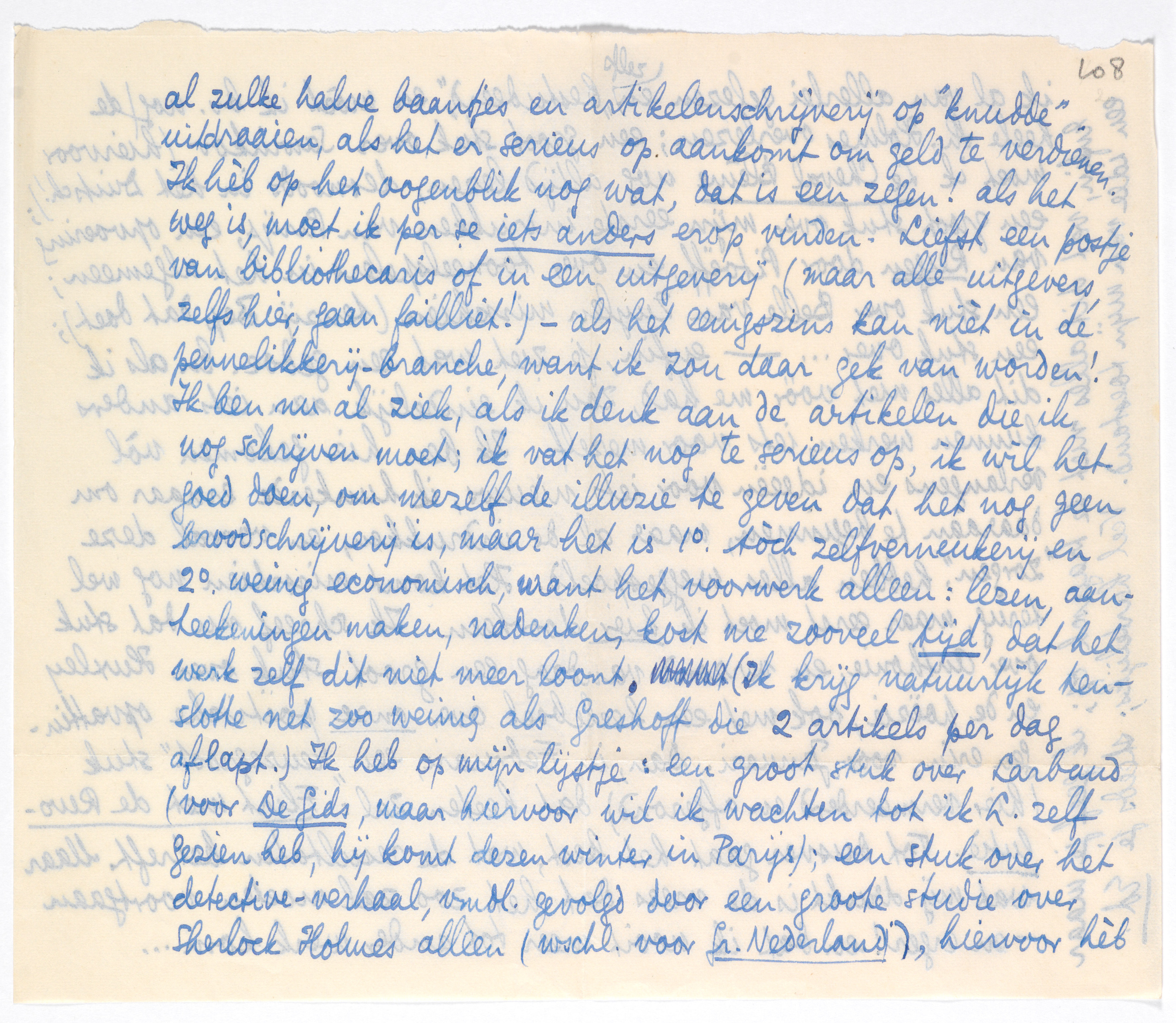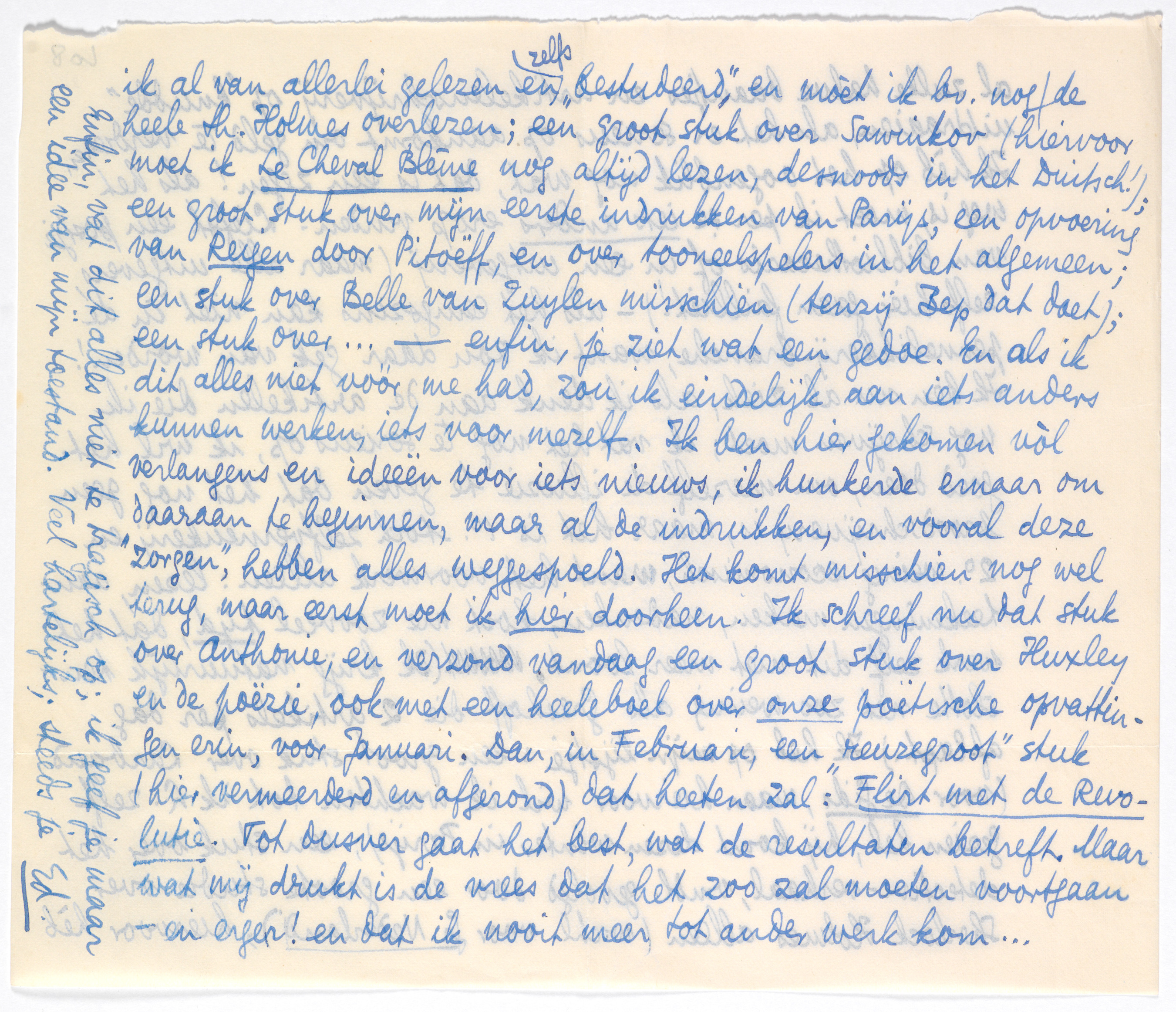 Verder is hier Roëll doodgegaan en heb ik vaag geïnformeerd naar een postje van journalist, correspondent, secretaris of brievendichtlikker, maar tot dusver weet niemand van iets. Ik zou Van Loon wel erover willen polsen, maar de goeie man schijnt gepiqueerd (volgens Van Uytvanck) over een geweigerd stuk voor Forum. - En aan den anderen kant, hoe meer ik erover nadenk, hoe meer ik besef dat al zulke halve baantjes en artikelenschrijverij op ‘knudde’ uitdraaien, als het er serieus op aankomt om geld te verdienen. Ik héb op het oogenblik nog wat, dat is een zegen! als het weg is, moet ik per se iets anders erop vinden. Liefst een postje van bibliothecaris of in een uitgeverij (maar alle uitgevers, zelfs hier, gaan failliet!) - als het eenigszins kan nièt in de pennelikkerij-branche, want ik zou daar gek van worden! Ik ben nu al ziek, als ik denk aan de artikelen die ik nog schrijven moet; ik vat het nog te serieus op, ik wil het goed doen, om mezelf de illuzie te geven dat het nog geen broodschrij-verij is, maar het is 1o. tòch zelfverneukerij en 2o. weinig economisch, want het voorwerk alleen: lezen, aanteekeningen maken, nadenken, kost me zoveel tijd, dat het werk zelf dit niet meer loont. (Ik krijg natuurlijk tenslotte net zoo weinig als Greshoff die 2 artikels per dag aflapt.) Ik heb op mijn lijstje: een groot stuk over Larbaud (voor De Gids, maar hiervoor wil ik wachten tot ik L. zelf gezien heb, hij komt dezen winter in Parijs); een stuk over het detective-verhaal, vmdl. gevolgd door een groote studie over Sherlock Holmes alleen (wschl. voor Gr. Nederland), hiervoor hèb ik al van allerlei gelezen en zelfs ‘bestudeerd’, en moèt ik bv. nog de heele Sh. Holmes overlezen; een groot stuk over Sawinkov2415 (hiervoor moet ik Le Cheval Blême nog altijd lezen, desnoods in het Duitsch!); een groot stuk over mijn eerste indrukken van Parijs, een opvoering van Reigen door Pitoëff, en over tooneelspelers in het algemeen2416; een stuk over Belle van Zuylen2417 misschien (tenzij Bep dat doet); een stuk over... - enfin, je ziet wat een gedoe. En als ik dit alles niet vòòr me had, zou ik eindelijk aan iets anders kunnen werken, iets voor mezelf. Ik ben hier gekomen vòl verlangens en ideëen voor iets nieuws, ik hunkerde ernaar om daaraan te beginnen, maar al de indrukken, en vooral deze ‘zorgen’, hebben alles weggespoeld. Het komt misschien nog wel terug, maar eerst moet ik hier doorheen. Ik schreef nu dat stuk over Anthonie, en verzond vandaag een groot stuk over Huxley en de poëzie,2418 ook met een heeleboel over onze poëtische opvattingen erin, voor Januari. Dan, in Februari, een ‘reuzegroot’ stuk (hier vermeerderd en afgerond) dat heeten zal: Flirt met de Revolutie. Tot dusver gaat het best, wat de resultaten betreft. Maar wat mij drukt is de vrees dat het zoo zal moeten voortgaan - en erger! en dat ik nooit meer tot ander werk kom...