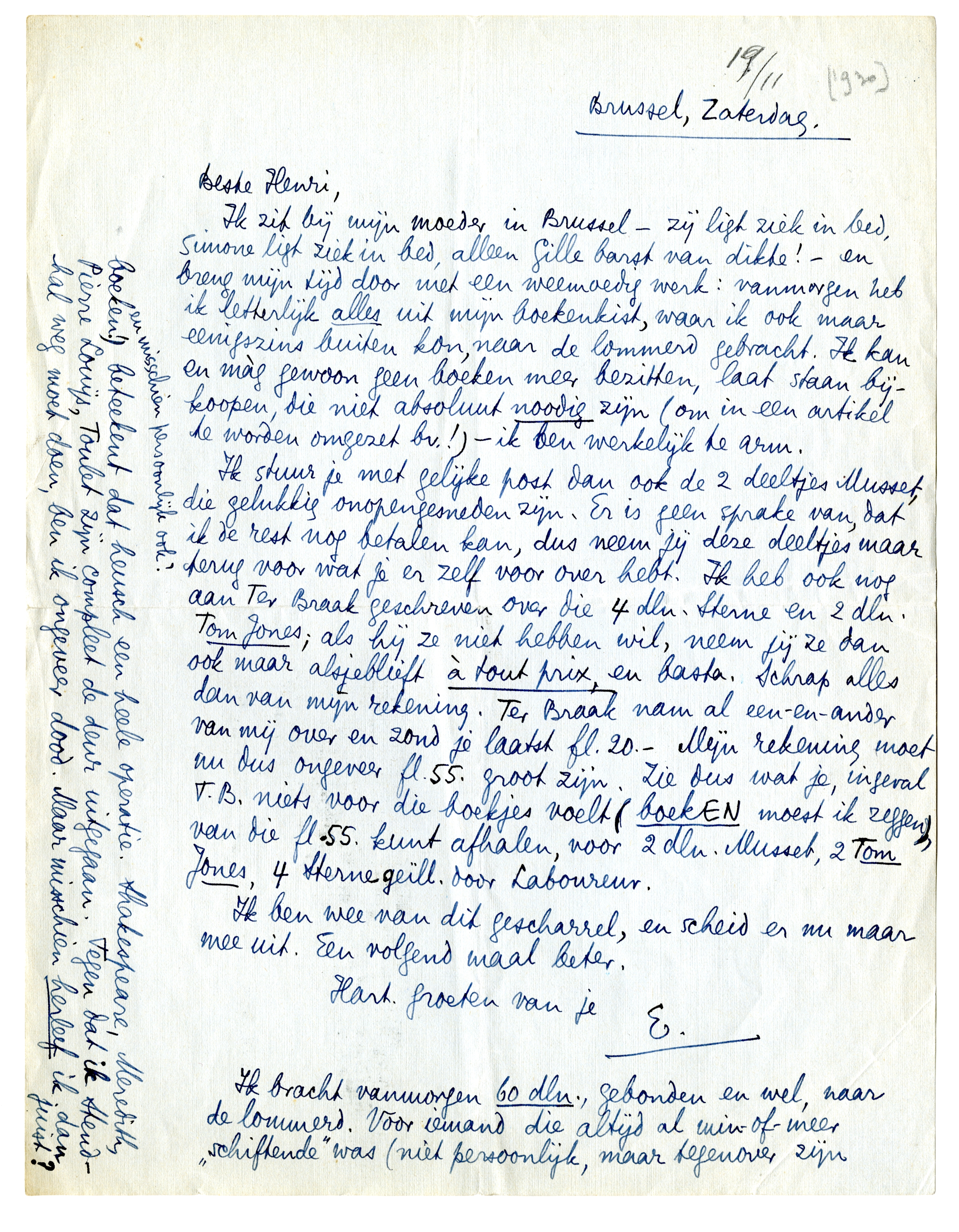 Ik stuur je met gelijke post dan ook de 2 deeltjes Musset, die gelukkig onopengesneden zijn. Er is geen sprake van, dat ik de rest nog betalen kan, dus neem jij deze deeltjes maar terug voor wat je er zelf voor over hebt. Ik heb ook nog aan Ter Braak geschreven over die 4 dln. Sterne en 2 dln. Tom Jones; als hij ze niet hebben wil, neem jij ze dan ook maar alsjeblieft à tout prix, en basta. Schrap alles dan van mijn rekening. Ter Braak nam al een-en-ander van mij over en zond je laatst fl.20.- Mijn rekening moet nu dus ongeveer fl.55 groot zijn. Zie dus wat je, ingeval T.B. niets voor die boekjes voelt (boekEN moest ik zeggen), van die fl.55. kunt afhalen, voor 2 dln. Musset, 2 Tom Jones, 4 Sterne geïll. door Laboureur.