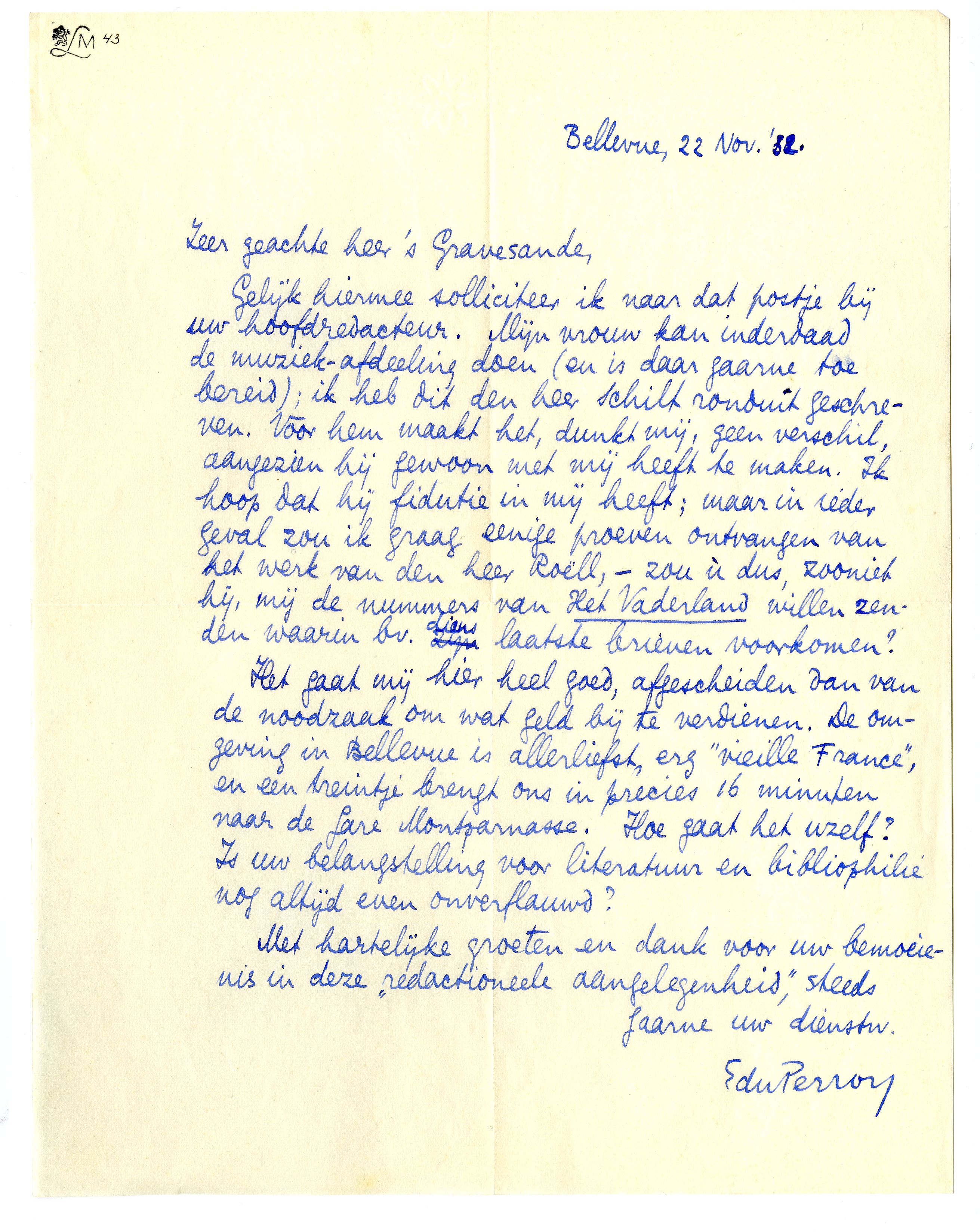 Het gaat mij hier heel goed, afgescheiden van de noodzaak om wat geld bij te verdienen. De omgeving in Bellevue is allerliefst, erg ‘vieille France’, en een treintje brengt ons in precies 16 minuten naar de Gare Montparnasse. Hoe gaat het uzelf? Is uw belangstelling voor literatuur en bibliophilie nog altijd even onverflauwd?