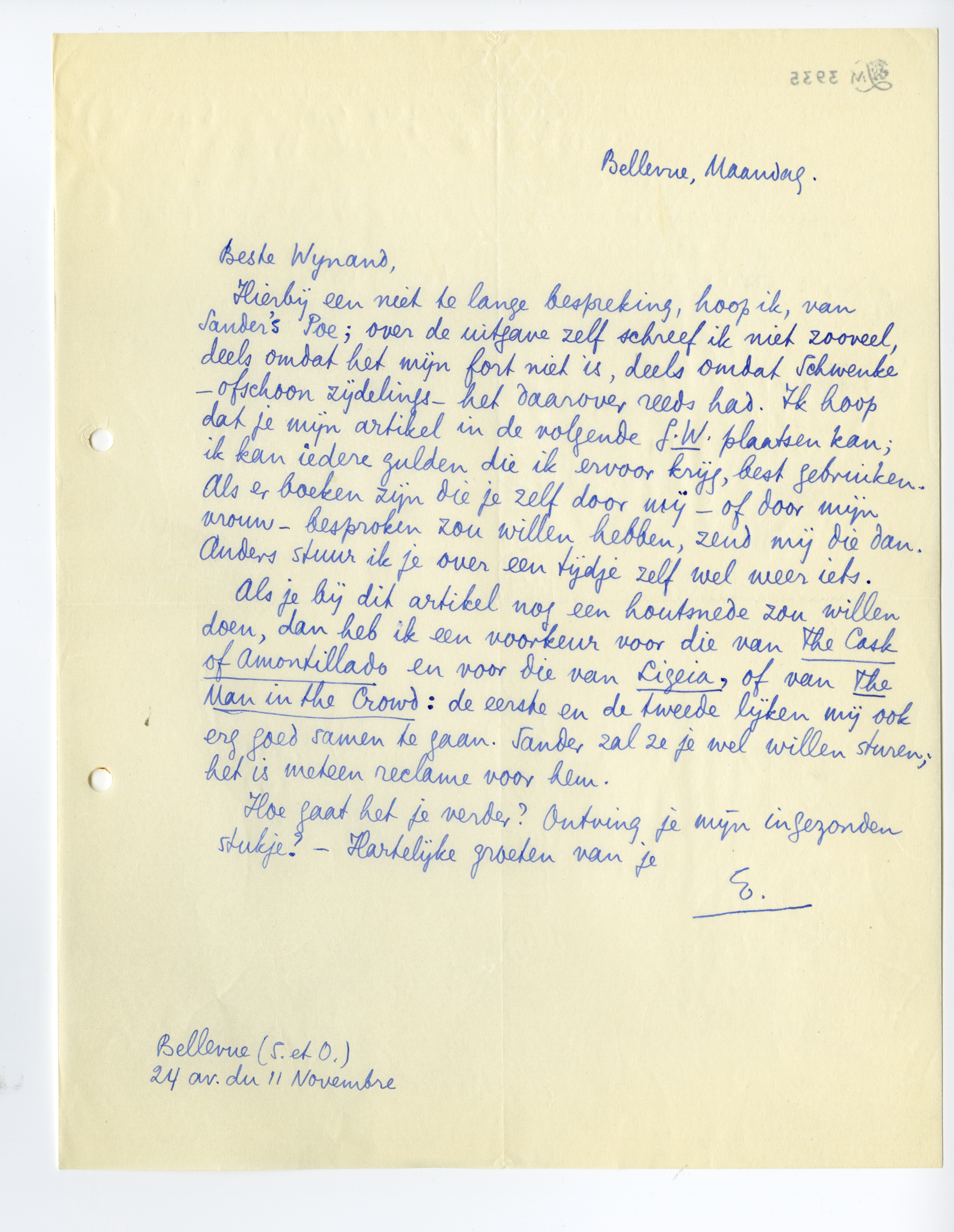 Hierbij een niet te lange bespreking, hoop ik, van Sander's Poe2441; over de uitgave zelf schreef ik niet zooveel, deels omdat het mijn fort niet is, deels omdat Schwenke - ofschoon zijdelings - het daarover reeds had. Ik hoop dat je mijn artikel in de volgende G.W. plaatsen kan; ik kan iedere gulden die ik ervoor krijg, best gebruiken. Als er boeken zijn die je zelf door mij - of door mijn vrouw - besproken zou willen hebben, zend mij die dan. Anders stuur ik je over een tijdje zelf wel weer iets.