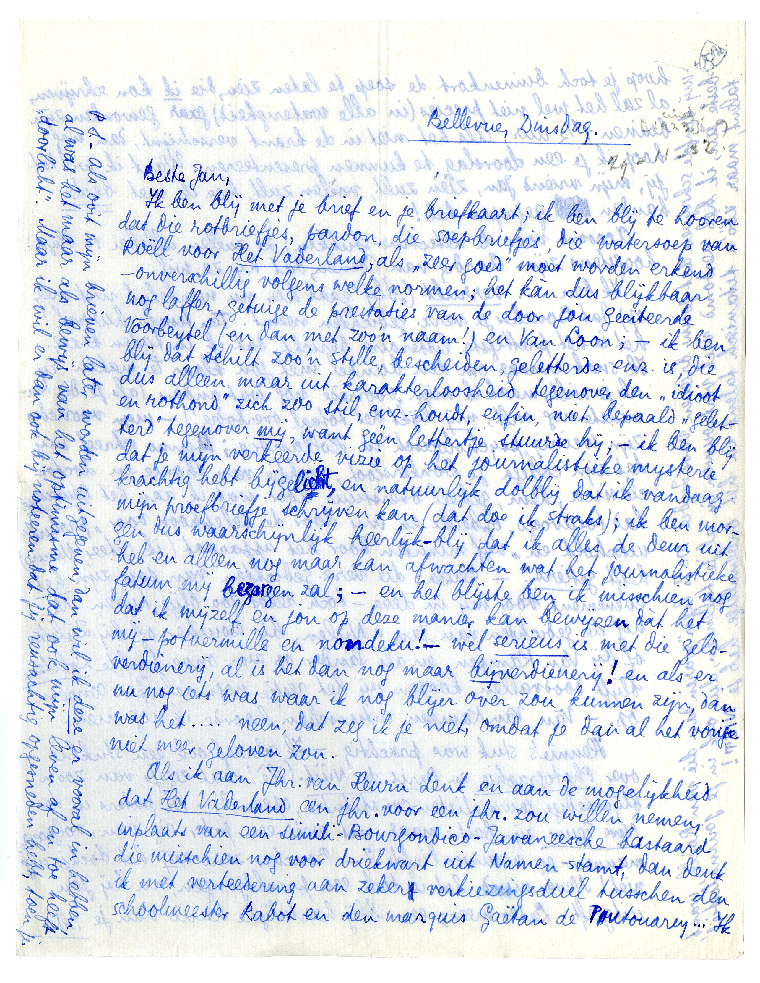 Als ik aan Jhr. van Heurn denk en aan de mogelijkheid dat Het Vaderland een jhr. voor een jhr. zou willen nemen, inplaats van een simili-Bourgondico-Javaneesche bastaard die misschien nog voor driekwart uit Namen stamt, dan denk ik met verteedering aan zeker verkiezingsduel tusschen den schoolmeester Rabot en den marquis Gaëtan de Putouarey...2443 Ik hoop je toch binnenkort de soep te laten zien, die ik kon schrijven, al zal het wel niet precies (in alle waterigheid) gaar geworden zijn binnen 1½ uur. Als het niet in de krant verschijnt, dan nòg hoop ik je een doorslag te kunnen presenteeren. Want ik wil dat jij, mijn vriend Jan, zièn zult, voèlen zult, hoe ik met beide2444 handen gegrepen heb!
