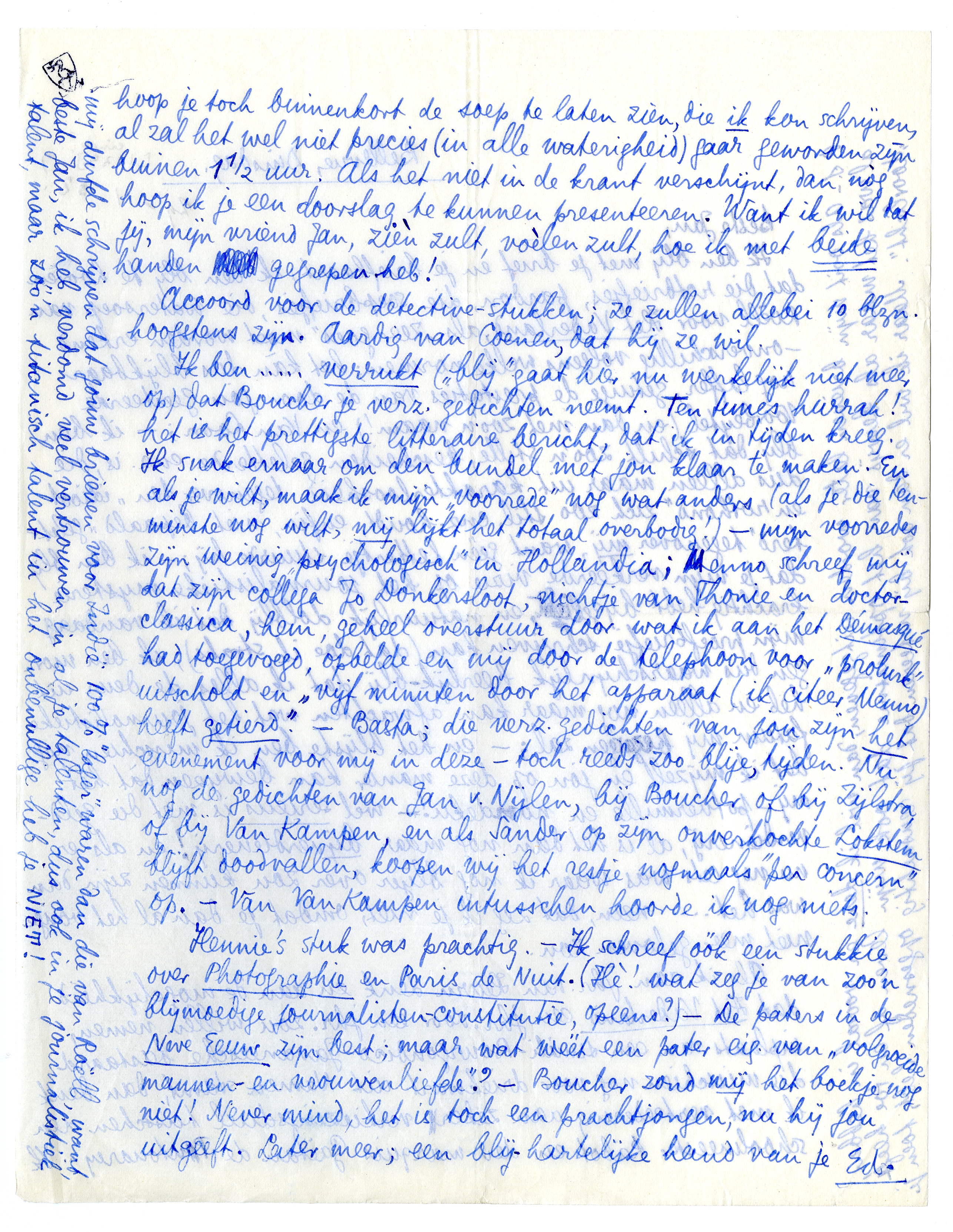 Ik ben..... verrukt (‘blij’ gaat hier nu werkelijk niet meer op) dat Boucher je verz. gedichten neemt. Ten times hurrah! het is het prettigste litteraire bericht, dat ik in tijden kreeg. Ik snak ernaar om den bundel met jou klaar te maken. En als je wilt, maak ik mijn ‘voorrede’ nog wat anders (als je die tenminste nog wilt, mij lijkt het totaal overbodig!) - mijn voorredes zijn weinig ‘psychologisch’ in Hollandia; Menno schreef mij dat zijn collega Jo Donkersloot, nichtje van Thonie en doctor-classica, hem, geheel overstuur door wat ik aan het Démasqué had toegevoegd, opbelde en mij door de telephoon voor ‘prolurk’ uitschold en ‘vijf minuten door het apparaat (ik citeer Menno) heeft getierd’. - Basta; die verz. gedichten van jou zijn het evenement voor mij in deze - toch reeds zoo blije, tijden. Nu nog de gedichten van Jan v. Nijlen, bij Boucher of bij Zijlstra, of bij Van Kampen, en als Sander op zijn onverkochte Lokstem blijft doodvallen, koopen wij het restje nogmaals ‘per concern’ op. - Van Van Kampen intusschen hoorde ik nog niets.
