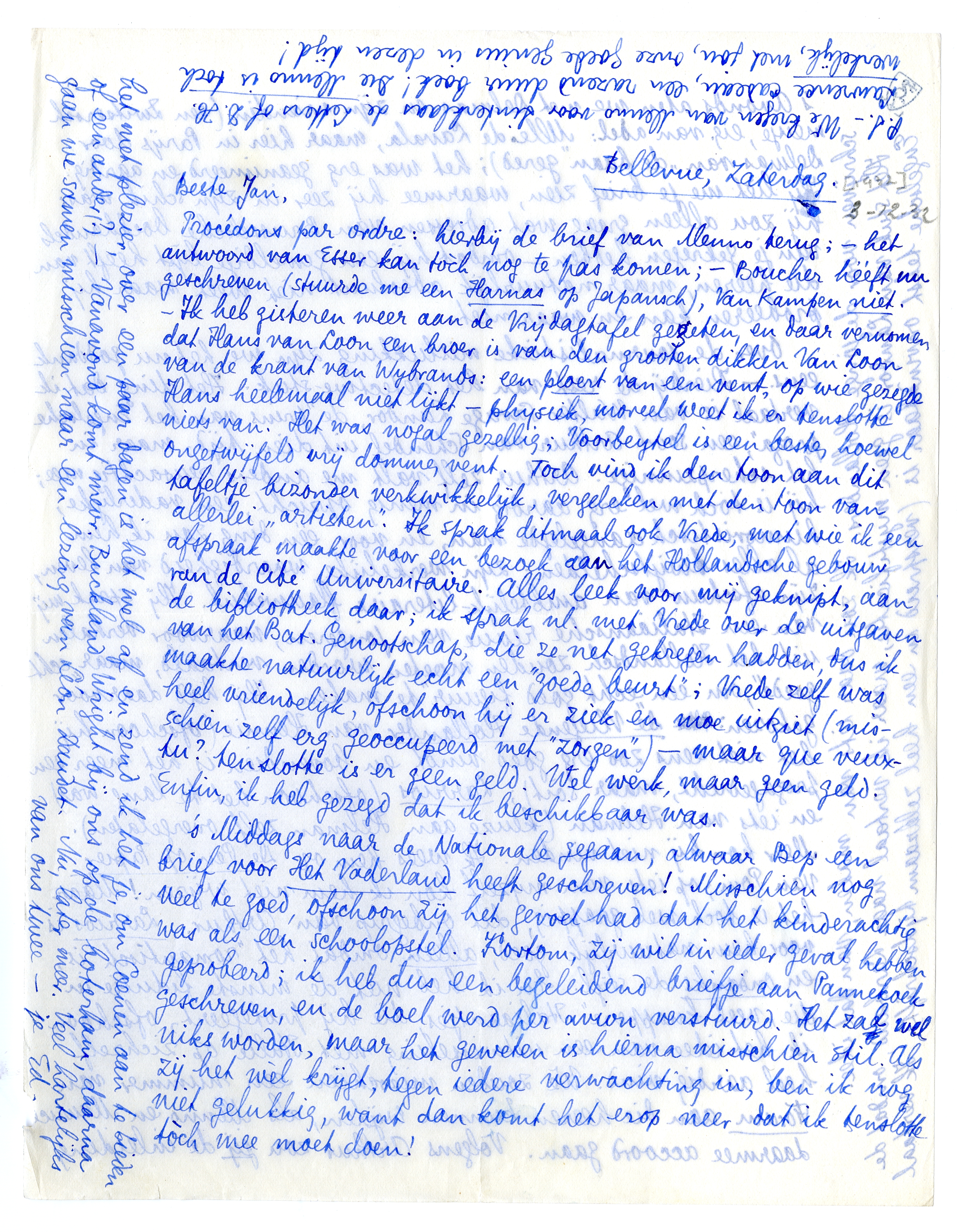 Procédons par ordre: hierbij de brief van Menno terug; - het antwoord van Esser kan tòch nog te pas komen; - Boucher hééft nu geschreven (stuurde me een Harnas op Japansch), Van Kampen niet. - Ik heb gisteren weer aan de Vrijdagtafel gegeten, en daar vernomen dat Hans van Loon een broer is van den grooten dikken Van Loon van de krant van Wybrands2449: een ploert van een vent, op wie gezegde Hans heelemaal niet lijkt - physiek, moreel weet ik er tenslotte niets van. Het was nogal gezellig; Voorbeytel is een beste, hoewel ongetwijfeld vrij domme, vent. Toch vind ik den toon aan dit tafeltje bizonder verkwikkelijk, vergeleken met den toon van allerlei ‘artisten’. Ik sprak ditmaal ook Vrede, met wie ik een afspraak maakte voor een bezoek aan het Hollandsche gebouw van de Cité Universitaire. Alles leek voor mij geknipt, aan de bibliotheek daar; ik sprak nl. met Vrede over de uitgaven van het Bat. Genootschap, die ze net gekregen hadden, dus ik maakte natuurlijk echt een ‘goede beurt’; Vrede zelf was heel vriendelijk, ofschoon hij er ziek en moe uitziet (misschien zelf erg geoccupeerd met ‘zorgen’) - maar que veux-tu? tenslotte is er geen geld. Wel werk, maar geen geld. Enfin, ik heb gezegd dat ik beschikbaar was.