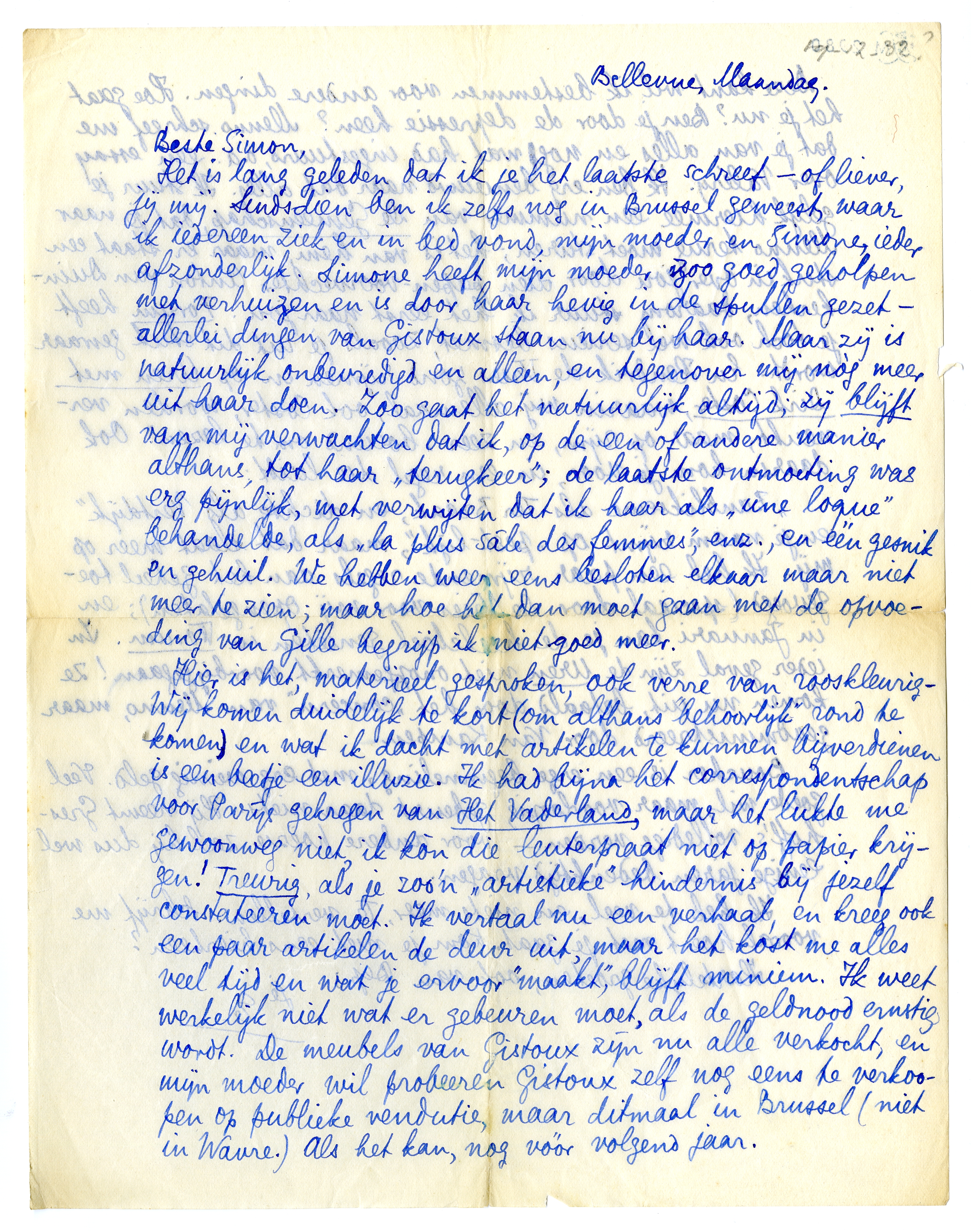 Het is lang geleden dat ik je het laatste schreef - of liever, jij mij. Sindsdien ben ik zelfs nog in Brussel geweest, waar ik iedereen ziek en in bed vond, mijn moeder en Simone, ieder afzonderlijk. Simone heeft mijn moeder zoo goed geholpen met verhuizen en is door haar hevig in de spullen gezet - allerlei dingen van Gistoux staan nu bij haar. Maar zij is natuurlijk onbevredigd en alleen, en tegenover mij nòg meer uit haar doen. Zoo gaat het natuurlijk altijd; zij blijft van mij verwachten dat ik, op de een of andere manier althans, tot haar ‘terugkeer’; de laatste ontmoeting was erg pijnlijk, met verwijten dat ik haar als ‘une loque’ behandelde, als ‘la plus sâle des femmes’, enz., en één gesnik en gehuil. We hebben weer eens besloten elkaar maar niet meer te zien; maar hoe het dan moet gaan met de opvoeding van Gille begrijp ik niet goed meer.