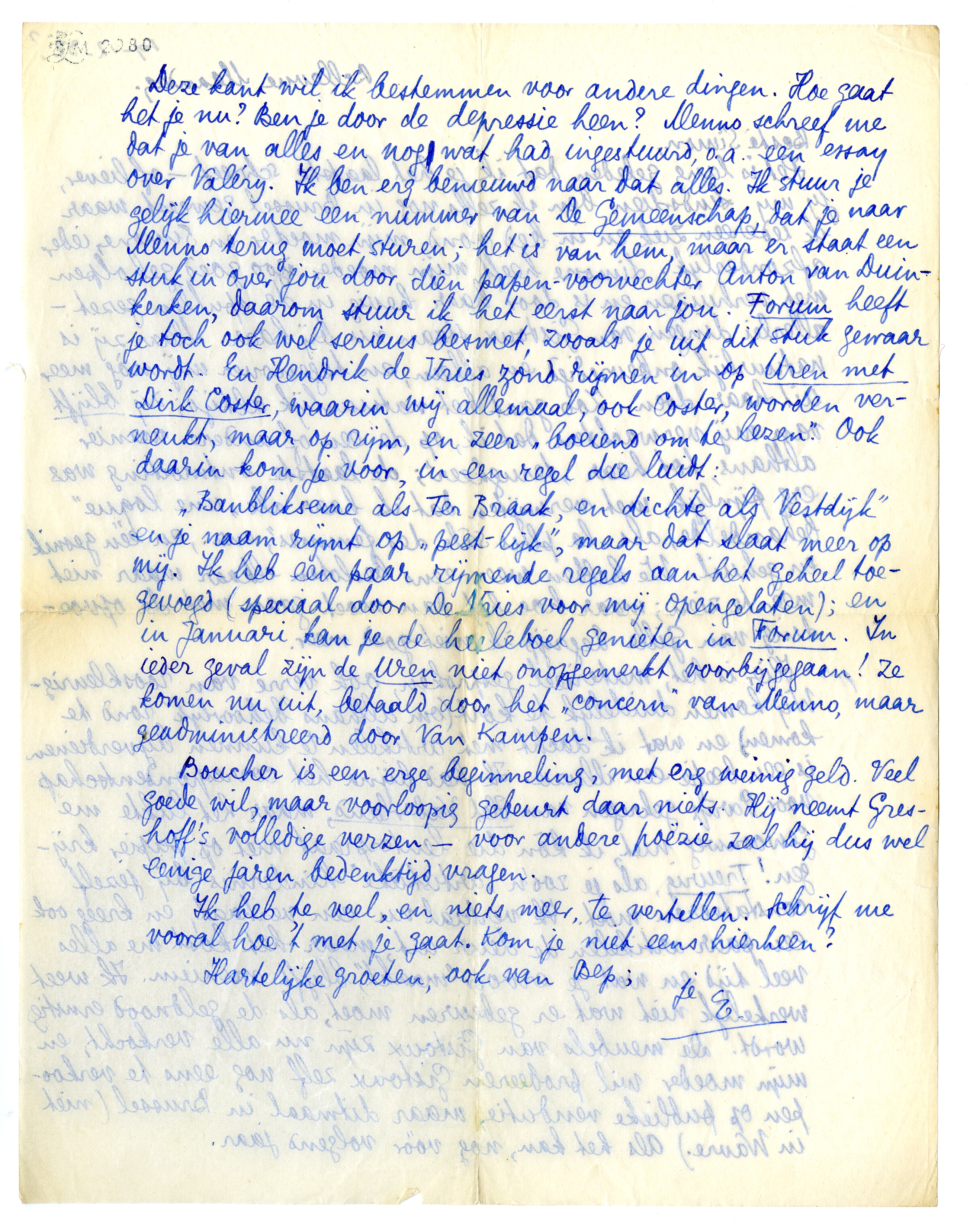 Deze kant wil ik bestemmen voor andere dingen. Hoe gaat het je nu? Ben je door de depressie heen? Menno schreef me2452 dat je van alles en nog wat had ingestuurd, o.a. een essay over Valéry.2453 Ik ben erg benieuwd naar dat alles. Ik stuur je gelijk hiermee een nummer van De Gemeenschap, dat je naar Menno terug moet sturen; het is van hem, maar er staat een stuk in over jou door dien papen-voorvechter Anton van Duinkerken,2454 daarom stuur ik het eerst naar jou. Forum heeft je toch ook wel serieus besmet, zooals je uit dit stuk gewaar wordt. En Hendrik de Vries zond rijmen in op Uren met Dirk Coster, waarin wij allemaal, ook Coster, worden verneukt, maar op rijm, en zeer ‘boeiend om te lezen’. Ook daarin kom je voor, in een regel die luidt: