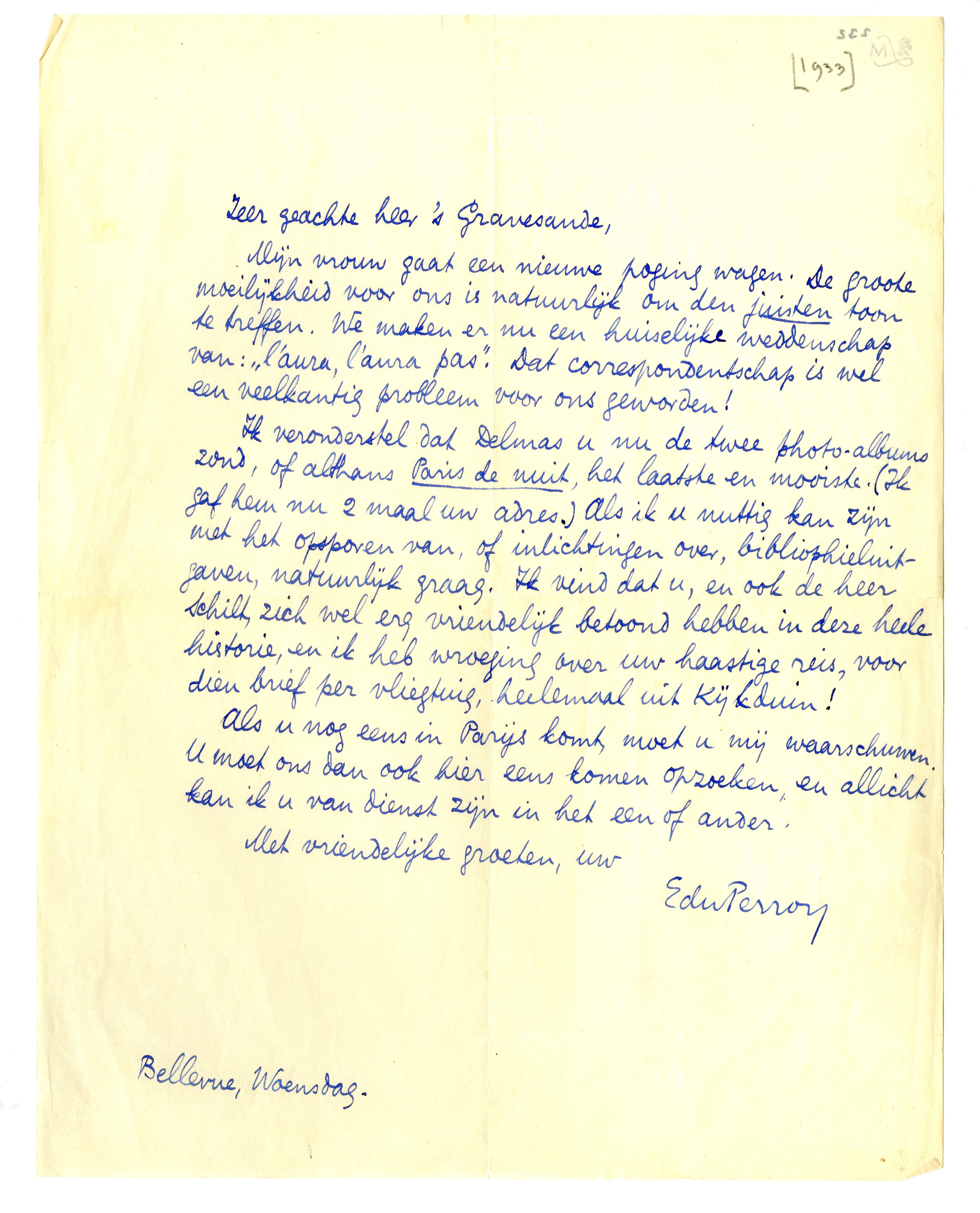 Ik veronderstel dat Delmas u nu de twee photo-albums zond, of althans Paris de nuit, het laatste en mooiste. (Ik gaf hem nu 2 maal uw adres.) Als ik u nuttig kan zijn met het opsporen van, of inlichtingen over, bibliophieluitgaven, natuurlijk graag. Ik vind dat u, en ook de heer Schilt, zich wel erg vriendelijk betoond hebben in deze heele historie, en ik heb wroeging over uw haastige reis, voor dien brief per vliegtuig, heelemaal uit Kijkduin!