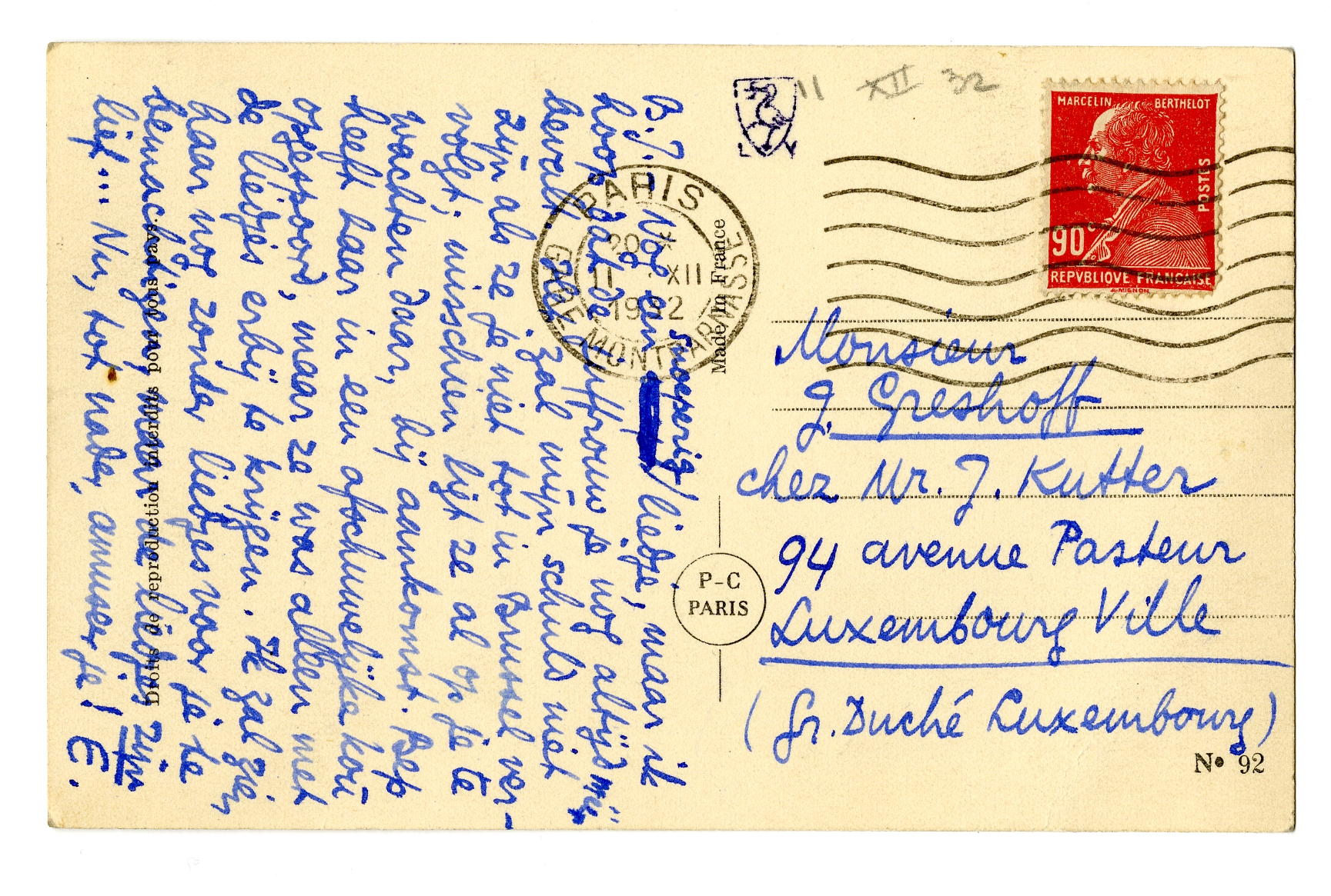 B.J. - Nog een snoeperig liedje, maar ik hoop dat de juffrouw je nog altijd méér bevalt. Het zal mijn schuld niet zijn als ze je niet in Brussel vervolgt; misschien ligt ze al op je te wachten daar, bij aankomst. Bep heeft haar in een afschuwelijke koû opgespoord, maar ze was alleen met de liedjes erbij te krijgen. Ik zal zien haar nog zonder liedjes voor je te bemachtigen, maar de liedjes zijn lief... Nu, tot nader, amuseer je!