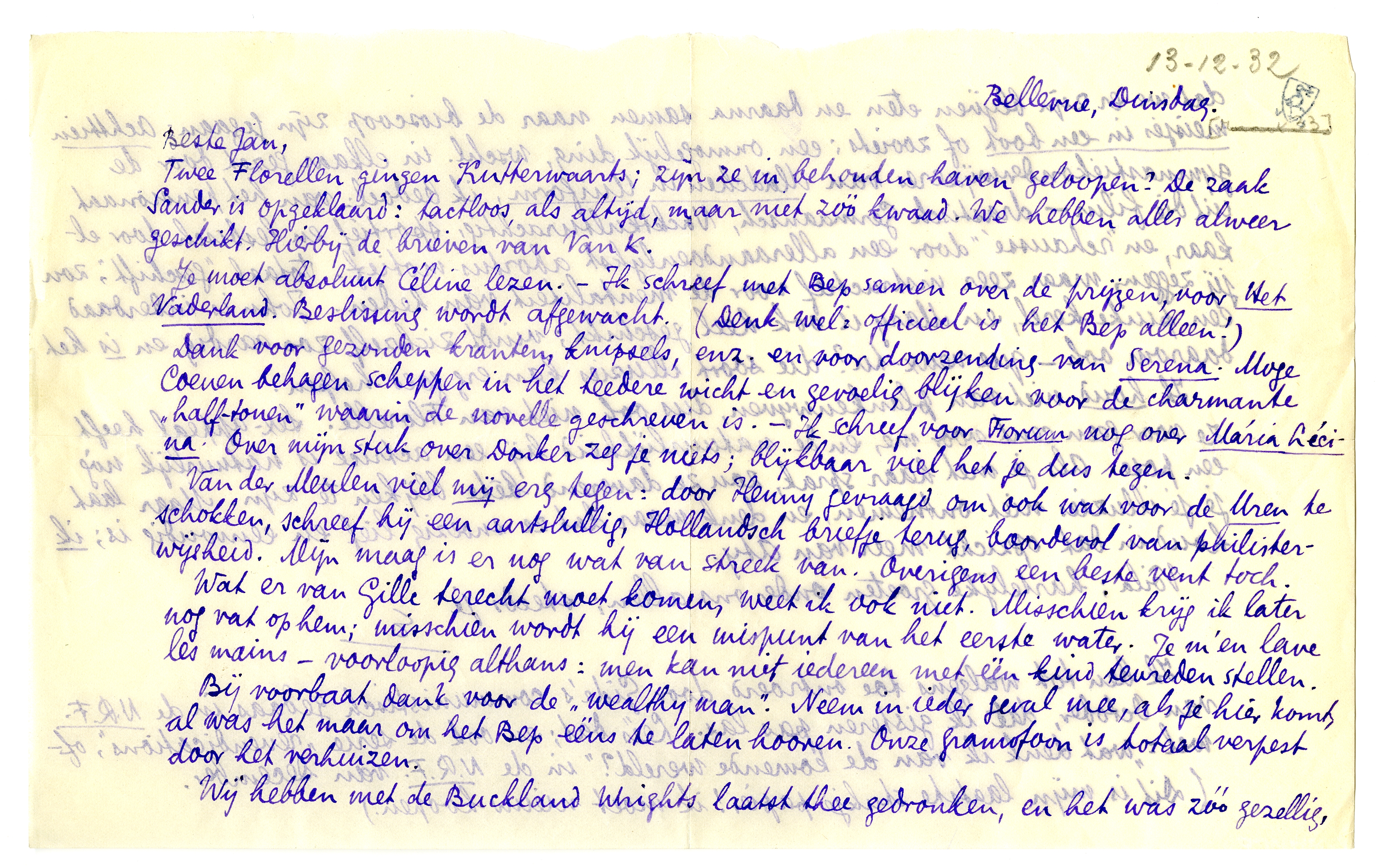 Je moet absoluut Céline lezen. - Ik schreef met Bep samen over de prijzen, voor Het Vaderland.2467 Beslissing wordt afgewacht. (Denk wel: officieel is het Bep alleen!)