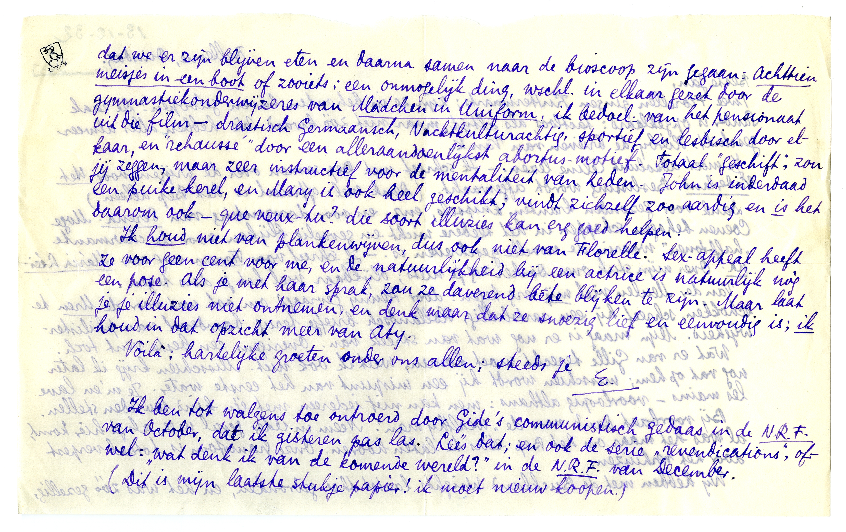 Wij hebben met de Buckland Wrights laatst thee gedronken, en het was zóó gezellig, dat we er zijn blijven eten en daarna samen naar de bioscoop zijn gegaan: Achttien meisjes in een boot of zooiets2469: een onmogelijk ding, wschl. in elkaar gezet door de gymnastiekonderwijzeres van Mädchen in Uniform, ik bedoel: van het pensionaat uit die film - drastisch Germaansch, Nacktkulturachtig, sportief en lesbisch door elkaar, en ‘rehaussé’ door een alleraandoenlijkst abortusmotief. Totaal ‘geschift’, zou jij zeggen, maar zeer instructief voor de mentaliteit van heden. John is inderdaad een puike kerel, en Mary is ook heel geschikt; vindt zichzelf zoo aardig en is het daarom ook - que veux tu? die soort illuzies kan erg goed helpen.