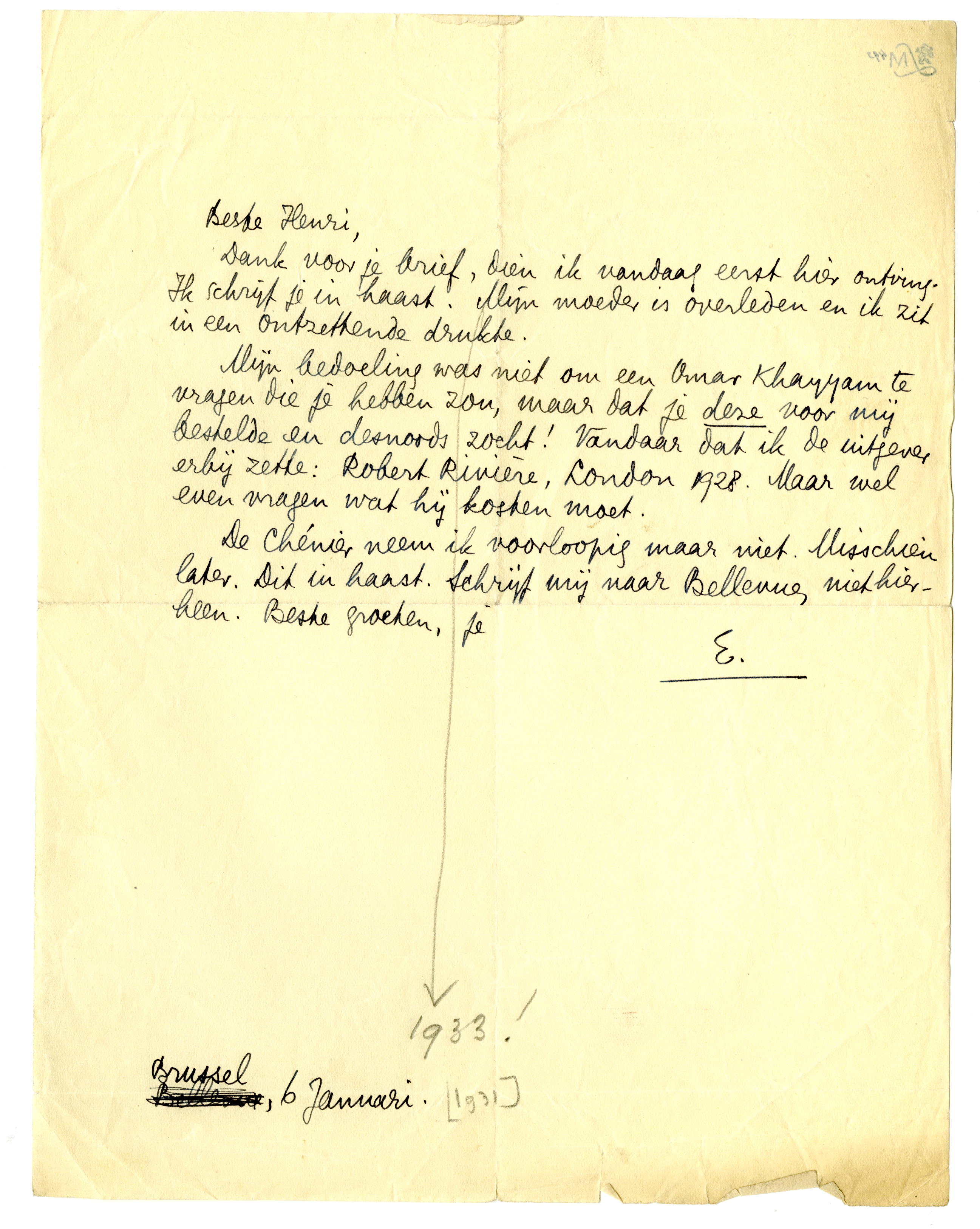 Dank voor je brief, dien ik vandaag eerst hier ontving. Ik schrijf je in haast. Mijn moeder is overleden en ik zit in een ontzettende drukte.