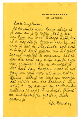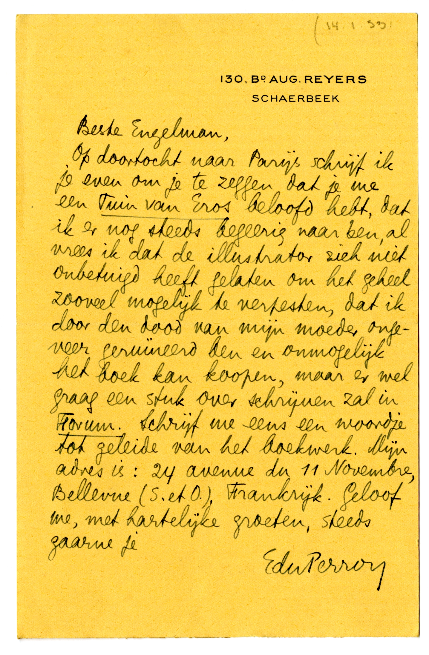 Op doortocht naar Parijs schrijf ik je even om je te zeggen dat je me een Tuin van Eros beloofd hebt, dat ik er nog steeds begeerig naar ben, al vrees ik dat de illustrator2505 zich niet onbetuigd heeft gelaten om het geheel zooveel mogelijk te verpesten, dat ik door den dood van mijn moeder ongeveer geruïneerd ben en onmogelijk het boek kan koopen, maar er wel graag een stuk over schrijven zal in Forum.2506 Schrijf me eens een woordje tot geleide van het boekwerk. Mijn adres is: 24 avenue du 11 Novembre, Bellevue (S. et O.), Frankrijk. Geloof me, met hartelijke groeten, steeds gaarne je
