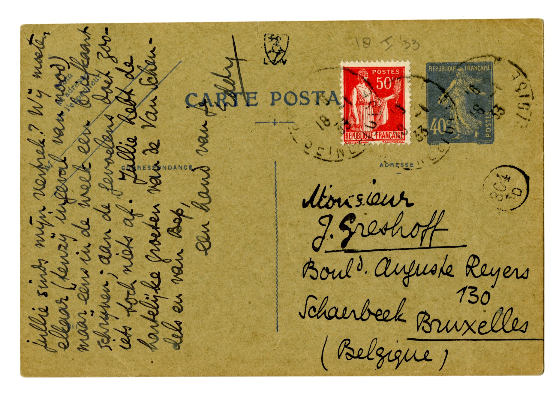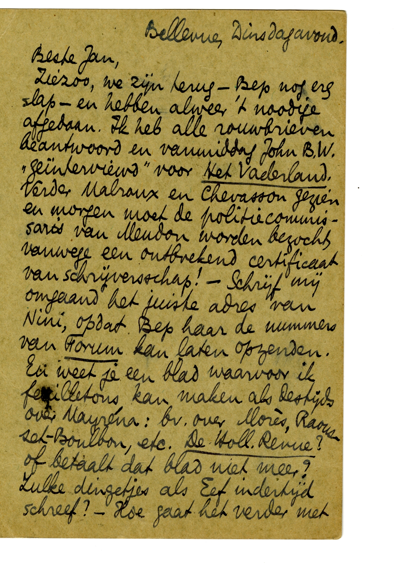 Ziezoo, we zijn terug - Bep nog erg slap - en hebben alweer 't noodige afgedaan. Ik heb alle rouwbrieven beantwoord en vanmiddag John B.W. ‘geïnterviewd’ voor Het Vaderland. Verder Malraux en Chevasson gezien en morgen moet de politiecommissaris van Meudon worden bezocht, vanwege een ontbrekend certificaat van schrijversschap! - Schrijf mij omgaand het juiste adres van Nini, opdat Bep haar nummers van Forum kan laten opzenden. En weet je een blad waarvoor ik feuilletons kan maken als destijds over Mayréna2507: bv. over Morès, Raousset-Boulbon,2508 etc. De Holl. Revue? of betaalt dat blad niet meer? Zulke dingetjes als Eef indertijd schreef? - Hoe gaat het verder met jullie sinds mijn vertrek? Wij moeten elkaar (tenzij ingeval van nood) maar ééns in de week een briefkaart schrijven; aan de gevoelens doet zooiets toch niets af. Jullie hebt de hartelijke groeten van de Van Schendels en van Bep,