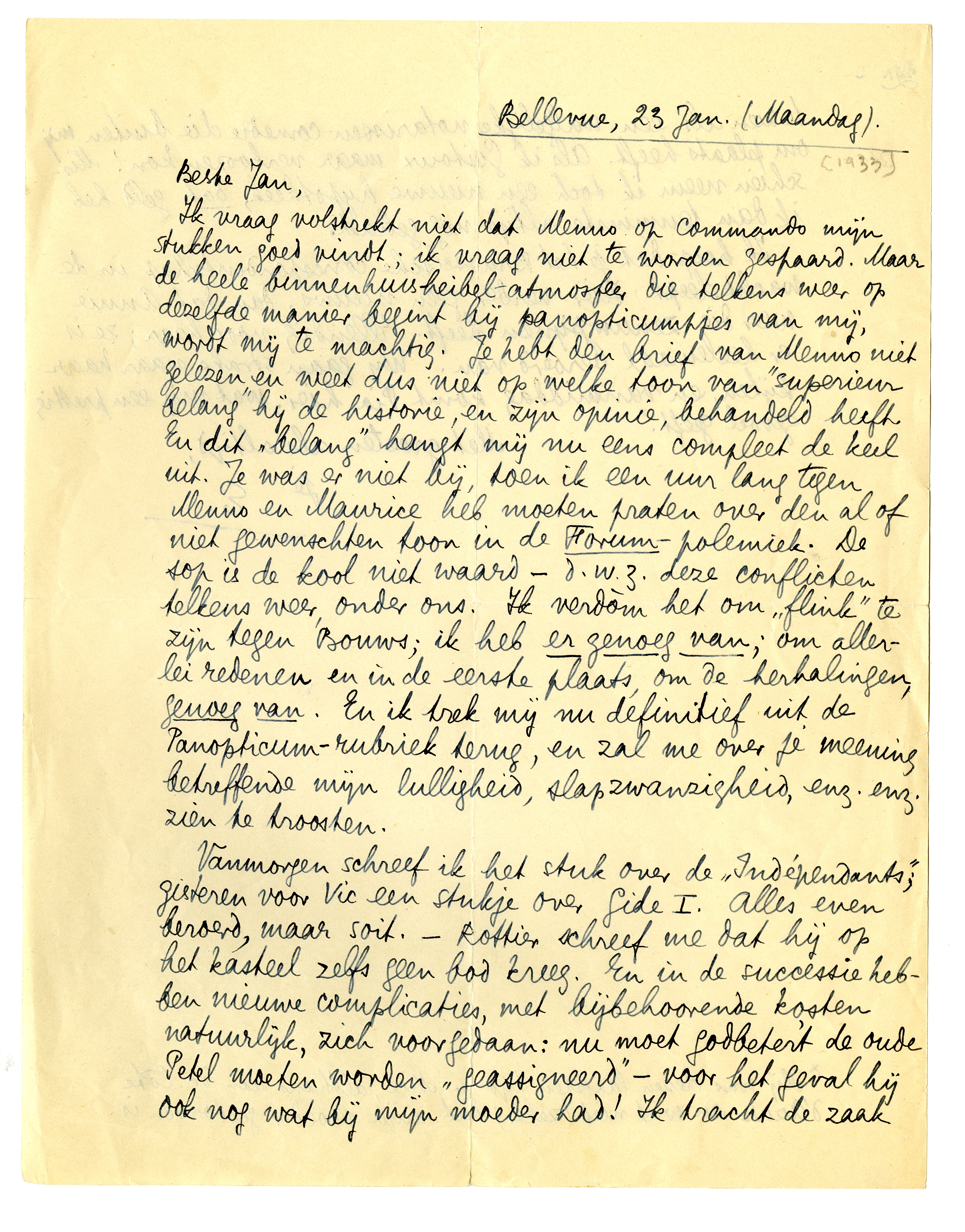 Ik vraag volstrekt niet dat Menno op commando mijn stukken goed vindt; ik vraag niet te worden gespaard. Maar de heele binnenhuis-heibel-atmosfeer die telkens weer op dezelfde manier begint bij panopticumpjes van mij, wordt mij te machtig. Je hebt den brief van Menno niet gelezen en weet dus niet op welke toon van ‘superieur belang’ hij de historie, en zijn opinie, behandeld heeft. En dit ‘belang’ hangt mij nu eens compleet de keel uit. Je was er niet bij, toen ik een uur lang tegen Menno en Maurice heb moeten praten over den al of niet gewenschten toon in de Forum-polemiek. De sop is de kool niet waard - d.w.z. deze conflicten telkens weer onder ons. Ik verdòm het om ‘flink’ te zijn tegen Bouws; ik heb er genoeg van; om allerlei redenen en in de eerste plaats, om de herhalingen, genoeg van. En ik trek mij nu definitief uit de Panopticum-rubriek terug, en zal me over je meening betreffende mijn lulligheid, slapzwanzigheid, enz. enz. zien te troosten.