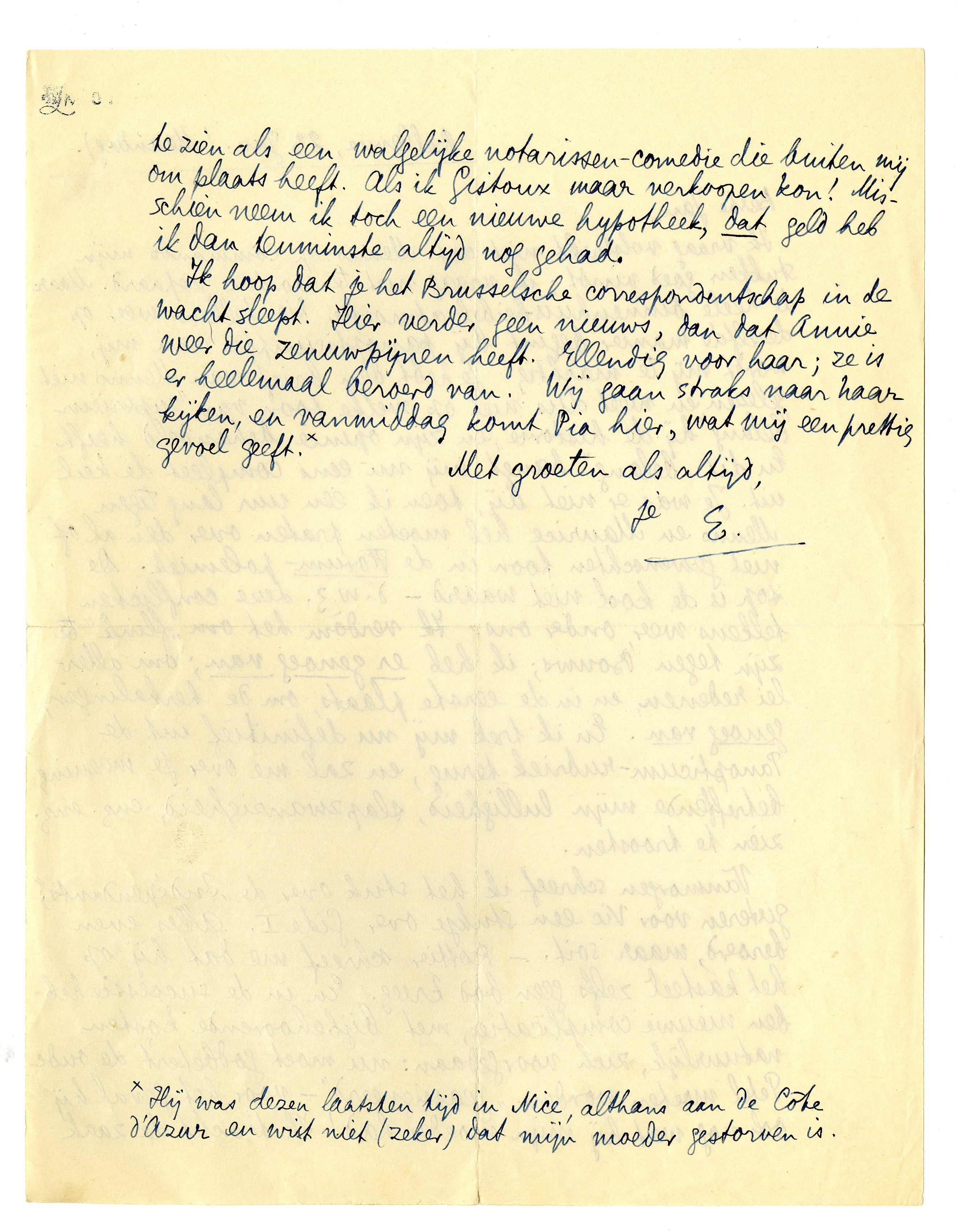 Vanmorgen schreef ik het stuk over de ‘Indépendants’; gisteren voor Vic een stukje over Gide I.2516 Alles even beroerd, maar soit. - Rottier schreef me dat hij op het kasteel zelfs geen bod kreeg. En in de successie hebben nieuwe complicaties, met bijbehoorende kosten natuurlijk, zich voorgedaan: nu moet godbeter't de oude Petel2517 moeten worden ‘geassigneerd’ - voor het geval hij ook nog wat bij mijn moeder had! Ik tracht de zaak te zien als een walgelijke notarissen-comedie die buiten mij om plaats heeft. Als ik Gistoux maar verkoopen kon! Misschien neem ik toch een nieuwe hypotheek, dat geld heb ik dan tenminste altijd nog gehad.