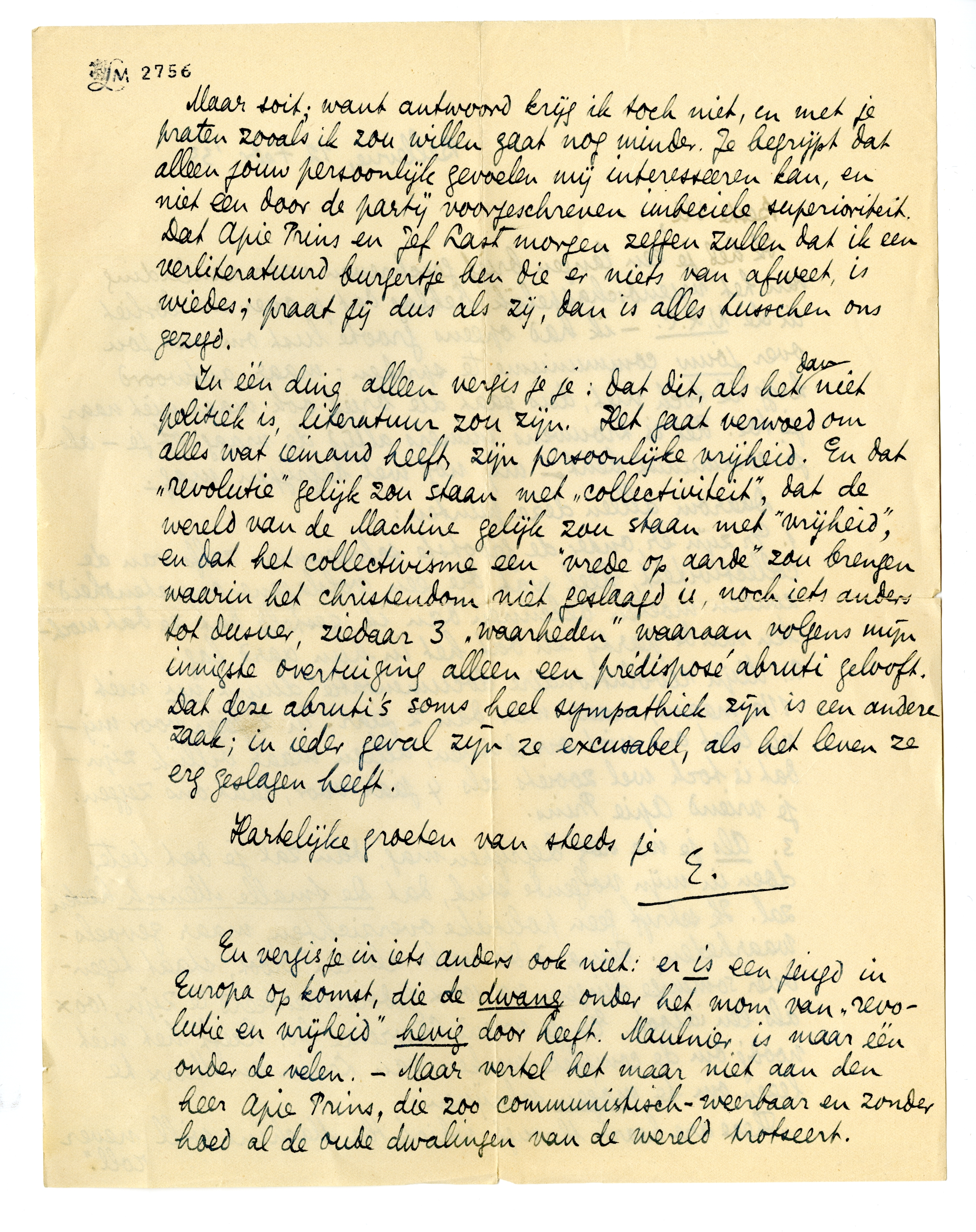In één ding alleen vergis je je: dat dit, als het dan niet politiek is, literatuur zou zijn. Het gaat verwoed om alles wat iemand heeft, zijn persoonlijke vrijheid. En dat ‘revolutie’ gelijk zou staan met ‘collectiviteit’, dat de wereld van de Machine gelijk zou staan met ‘vrijheid’, en dat het collectivisme een ‘vrede op aarde’ zou brengen waarin het christendom niet geslaagd is, noch iets anders tot dusver, ziedaar 3 ‘waarheden’ waaraan volgens mijn innigste overtuiging alleen een prédisposé abruti gelooft. Dat deze abruti's soms heel sympathiek zijn is een andere zaak; in ieder geval zijn ze excusabel, als het leven ze erg geslagen heeft.