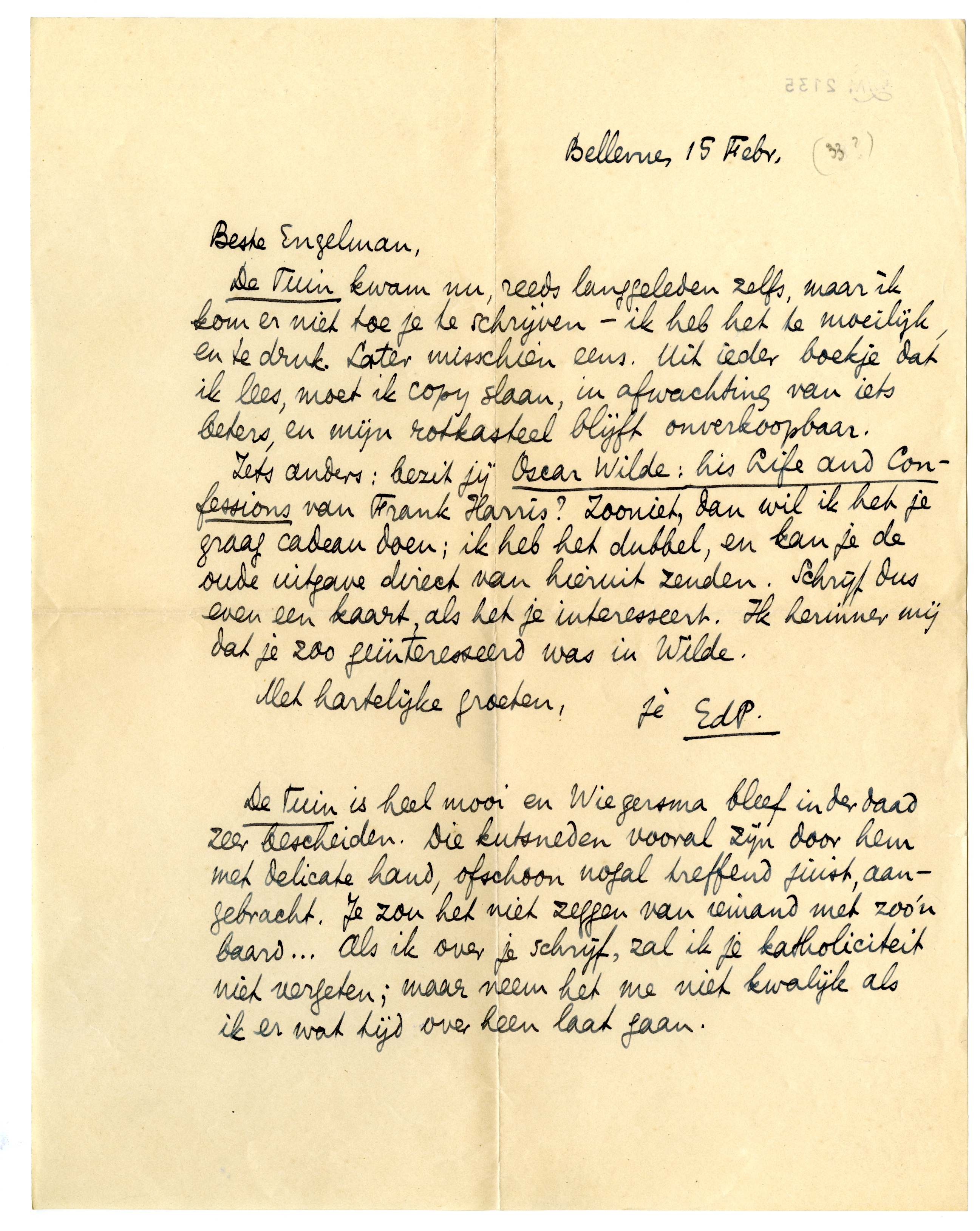 Iets anders: bezit jij Oscar Wilde: his Life and Confessions van Frank Harris? Zooniet, dan wil ik het je graag cadeau doen; ik heb het dubbel, en kan je de oude uitgave direct van hieruit zenden. Schrijf dus even een kaart, als het je interesseert. Ik herinner mij dat je zoo geïnteresseerd was in Wilde.