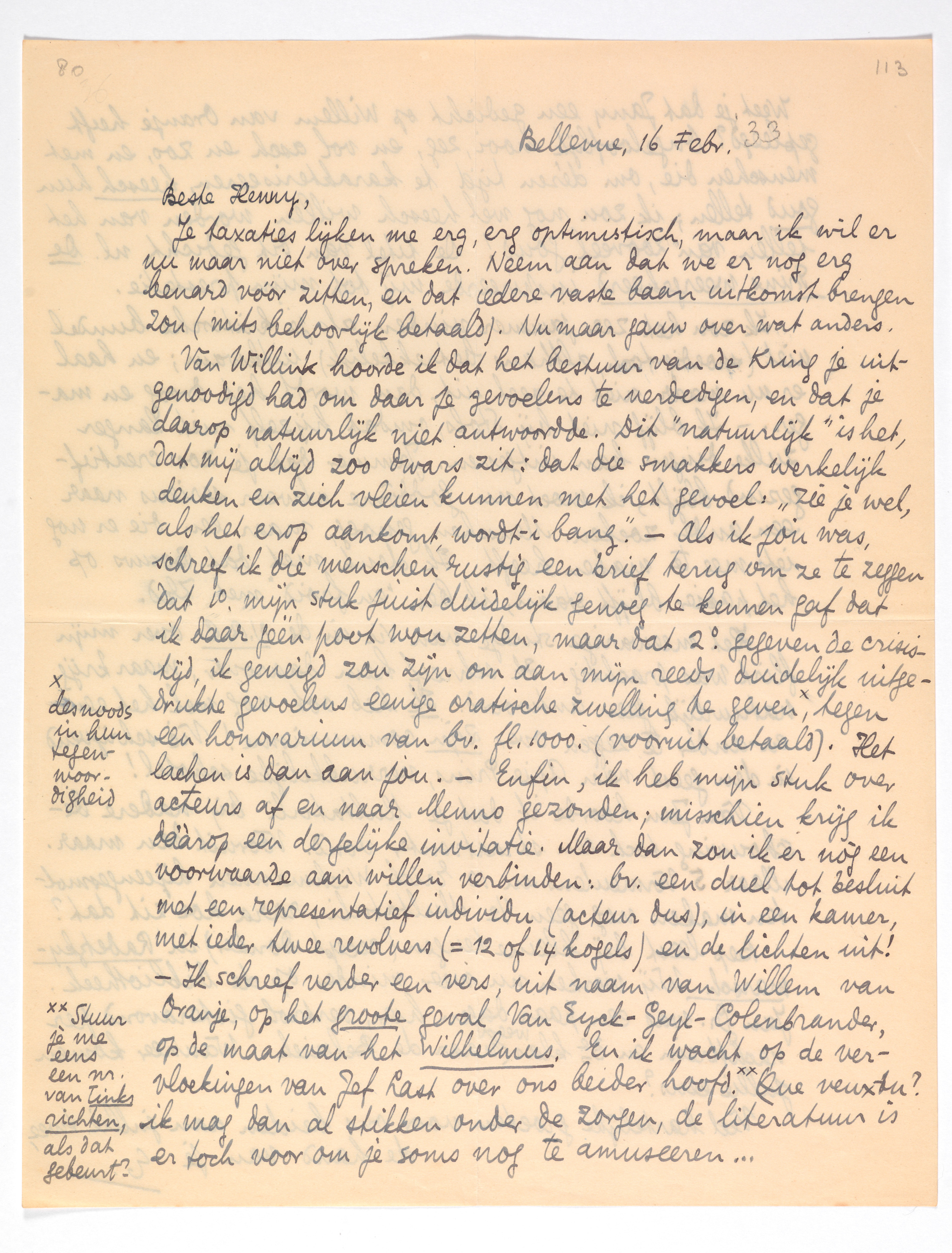 Van Willink hoorde ik dat het bestuur van de Kring je uitgenoodigd had om daar je gevoelens te verdedigen, en dat je daarop natuurlijk niet antwoordde. Dit ‘natuurlijk’ is het, dat mij altijd zoo dwars zit: dat die smakkers werkelijk denken en zich vleien kunnen met het gevoel: ‘zie je wel, als het erop aankomt, wordt-i bang’. - Als ik jou was, schreef ik die menschen rustig een brief terug om ze te zeggen dat 1o. mijn stuk juist duidelijk genoeg te kennen gaf dat ik daar géén poot wou zetten, maar dat 2o. gegeven de crisistijd, ik geneigd zou zijn om aan mijn reeds duidelijk uitgedrukte gevoelens eenige oratische zwelling te geven,* tegen een honorarium van bv. fl.1000. (vooruit betaald). Het lachen is dan aan jou. - Enfin, ik heb mijn stuk over acteurs2545 af en naar Menno gezonden; misschien krijg ik dààrop een dergelijke invitatie. Maar dan zou ik er nòg een voorwaarde aan willen verbinden: bv. een duel tot besluit met een representatief individu (acteur dus), in een kamer, met ieder twee revolvers (= 12 of 14 kogels) en de lichten uit! - Ik schreef verder een vers, uit naam van Willem van Oranje, op het groote geval Van Eyck-Geyl-Colenbrander, op de maat van het Wilhelmus. En ik wacht op de vervloekingen van Jef Last over ons beider hoofd.2546 Que veux-tu? ik mag dan al stikken onder de zorgen, de literatuur is er toch voor om je soms nog te amuseeren...