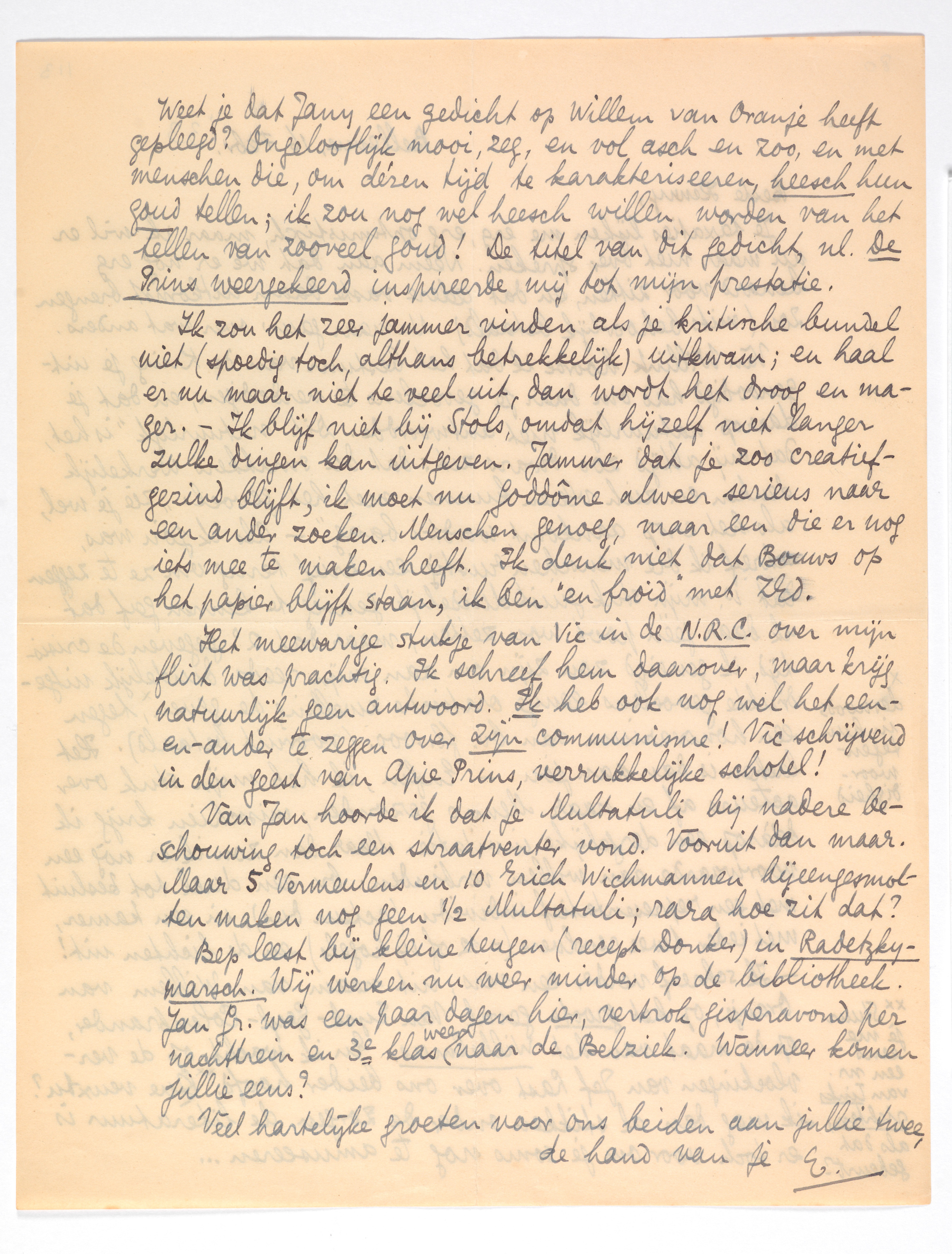 Het meewarige stukje van Vic in de N.R.C. over mijn flirt was prachtig. Ik schreef hem daarover, maar krijg natuurlijk geen antwoord. Ik heb ook nog wel het een-en-ander te zeggen over zijn communisme! Vic schrijvend in den geest van Apie Prins, verrukkelijke schotel!