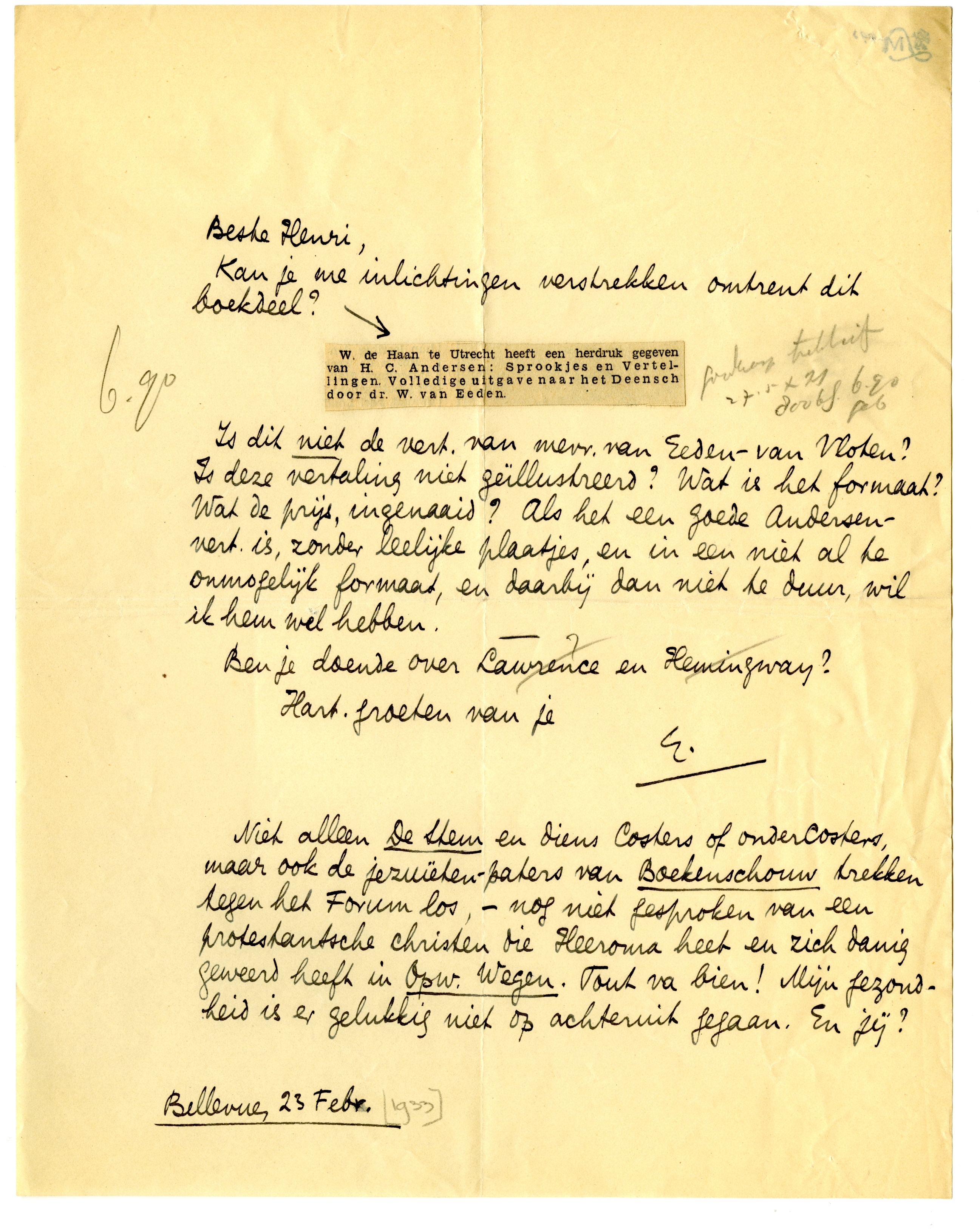 Niet alleen De Stem en diens Costers of onder Costers, maar ook de jezuïeten-paters van Boekenschouw trekken tegen het Forum los, - nog niet gesproken van een protestantsche christen die Heeroma heet en zich danig geweerd heeft in Opw. Wegen.2562 Tout va bien! Mijn gezondheid is er gelukkig niet op achteruit gegaan. En jij?