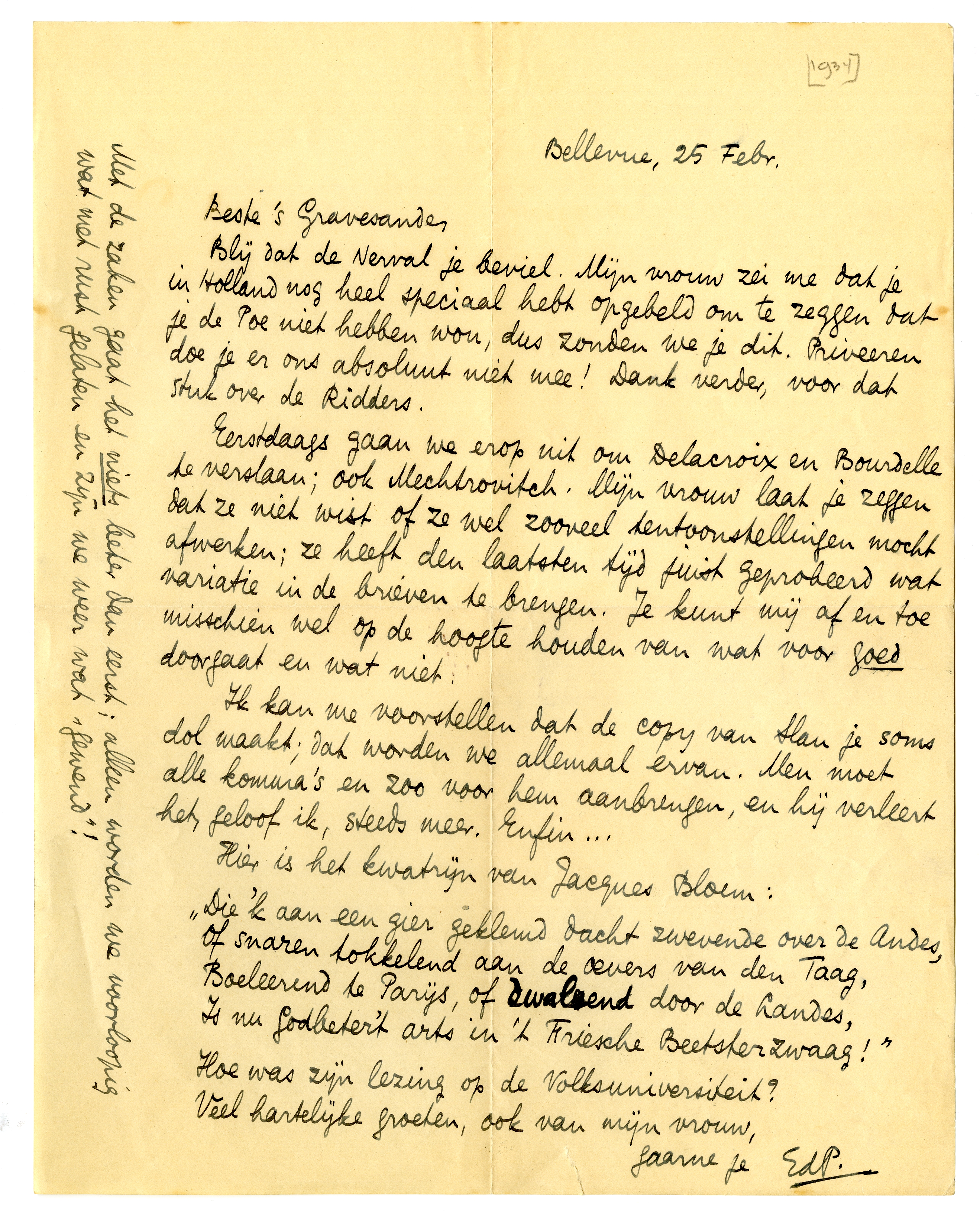 Eerstdaags gaan we erop uit om Delacroix en Bourdelle te verslaan; ook Mechtrovitch.2565 Mijn vrouw laat je zeggen dat ze niet wist of ze wel zooveel tentoonstellingen mocht afwerken; ze heeft den laatsten tijd juist geprobeerd wat variatie in de brieven te brengen. Je kunt mij af en toe misschien wel op de hoogte houden van wat voor goed doorgaat en wat niet.