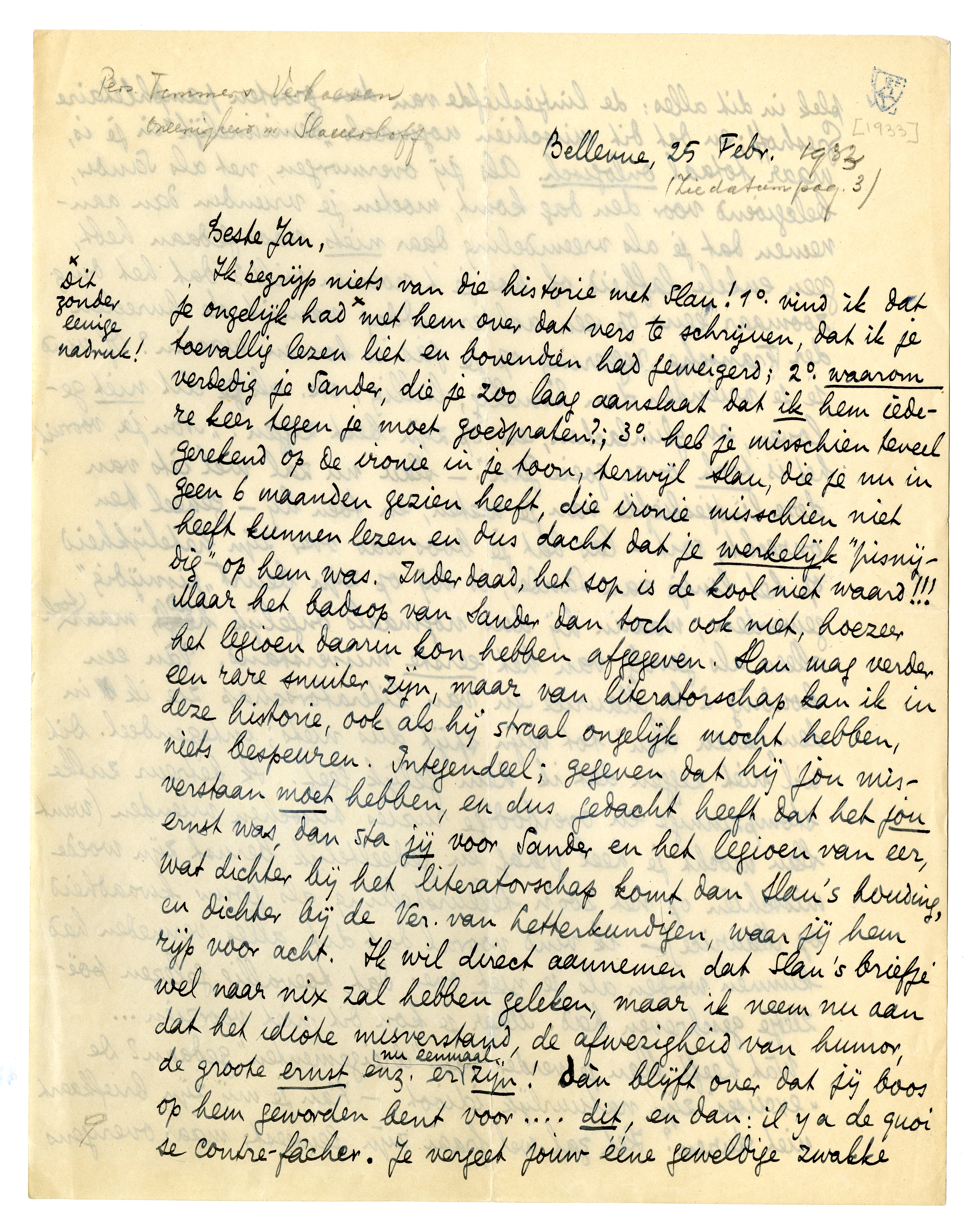 Ik begrijp niets van die historie met Slau!2567 1o. vind ik dat je ongelijk had* met hem over dat vers te schrijven, dat ik je toevallig lezen liet en bovendien had geweigerd; 2o. waarom verdedig je Sander, die je zoo laag aanslaat dat ik hem iedere keer tegen je moet goedpraten?; 3o. heb je misschien teveel gerekend op de ironie in je toon, terwijl Slau, die je nu in geen 6 maanden gezien heeft, die ironie misschien niet heeft kunnen lezen en dus dacht dat je werkelijk ‘pisnijdig’ op hem was. Inderdaad, het sop is de kool niet waard!!! Maar het badsop van Sander dan toch ook niet, hoezeer het legioen daarin kon hebben afgegeven. Slau mag verder een rare snuiter zijn, maar van literatorschap kan ik in deze historie, ook als hij straal ongelijk mocht hebben, niets bespeuren. Integendeel; gegeven dat hij jou misver-staan moet hebben, en dus gedacht heeft dat het jou ernst was, dan sta jij voor Sander en het legioen van eer, wat dichter bij het literatorschap komt dan Slau's houding en dichter bij de Ver. van Letterkundigen, waar jij hem rijp voor acht. Ik wil direct aannemen dat Slau's briefje wel naar nix zal hebben geleken, maar ik neem nu aan dat het idiote misverstand, de afwezigheid van humor, de groote ernst enz. er nu eenmaal zijn! dàn blijft over dat jij boos op hem geworden bent voor.... dit, en dan: il y a de quoi se contre-fâcher. Je vergeet jouw ééne geweldige zwakke plek in dit alles: de lintjesliefde van den grooten pamphlétaire Greshoff; en dat dit misschien nogmaals ‘beminnelijk’ in je is, maar totaal onlogisch. Als jij overmorgen, net als Sander, belegioend voor den dag komt, moeten je vrienden dan aannemen dat je als vreemdeling daar niets voor gedaan hebt, geen enkele lafheid of hoe je 't noemen wilt? dat het ding zoomaar eens op een achtermiddag vanuit de bureelen der Fransche regeering op je jas is komen waaien? Of vind je je vrienden dan knullig, lullig, etc. als ze dit niet geloven, en glimlachen, en op zijn best zeggen: ‘Nou ja, vooruit, het is toch onze goeie Jan’. - Slau nu zal wel ièts van deze lintjesliefde van je weten, en toen hij - geheel ten onrechte, soit - las dat je boos was over zijn hatelijkheid op het lintje van Sander, is hij op zijn beurt ‘pisnijdig’ geworden, waarin hij dus nogmaals ongelijk had, maar toch alleen als gevolg van het eerste misverstand. Van een houding à la Maurice en van literatorschap zie ik in den ‘raren Slau’ tot mijn spijt dus niets; integendeel. Dit wil niet zeggen dat ik hem gelijk geef. Ik betreur zulke stompzinnige en overbodige ruzies tusschen vrienden (want Slau mocht je heel graag, en gedeeltelijk berust zijn woede misschien op net zoo'n teleurstelling als jouw kwaadheid op Maurice) - ik vind vooral dat dit alles vermeden had kunnen worden als je niet over dat toevallig gelezen poëzietje geschreven had. Maar je kon dit niet voorzien...