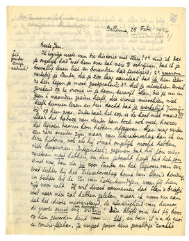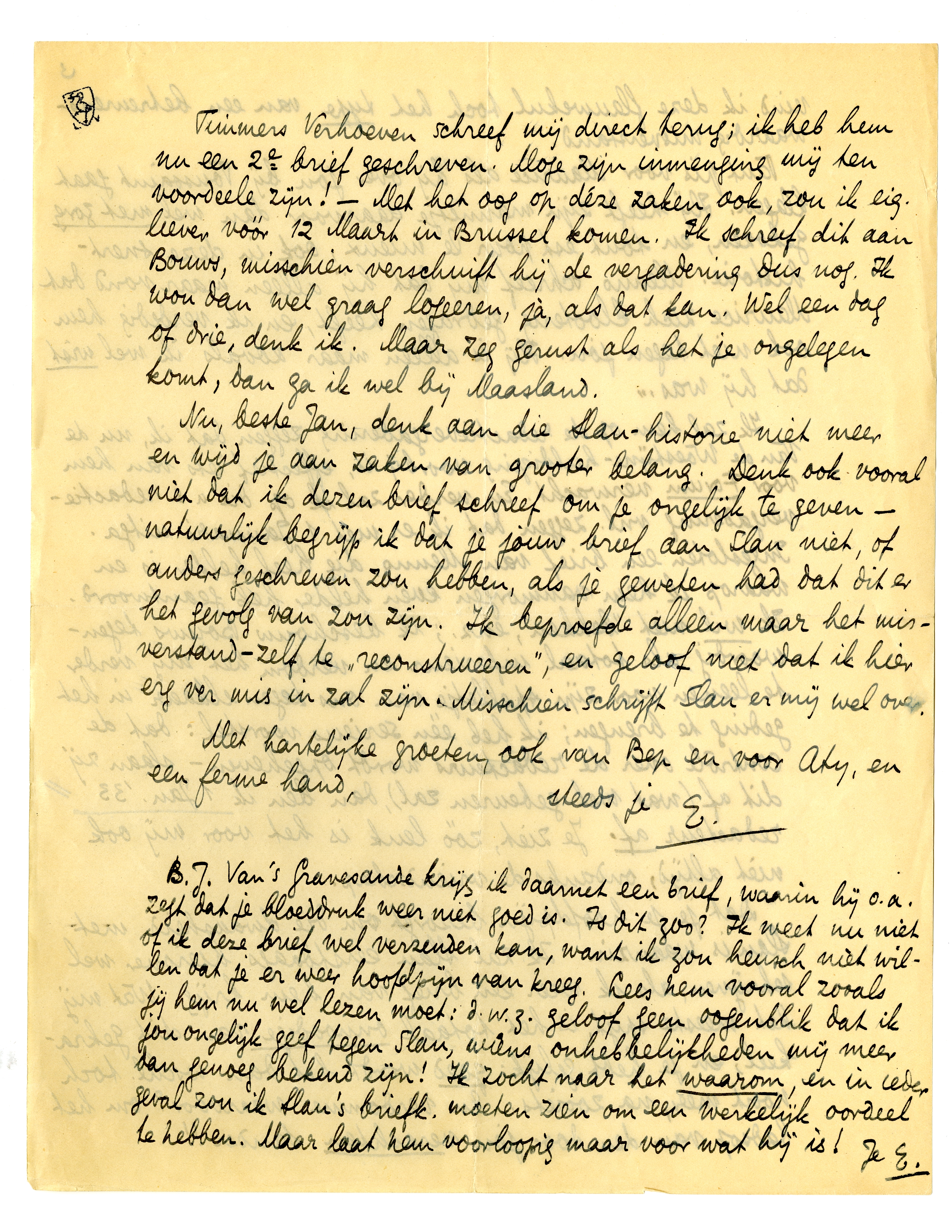 B.J. Van's Gravesande krijg ik daarnet een brief, waarin hij o.a. zegt dat je bloeddruk weer niet goed is. Is dit zoo? Ik weet nu niet of ik deze brief wel verzenden kan, want ik zou heusch niet willen dat je er weer hoofdpijn van kreeg. Lees hem vooral zooals jij hem nu wel lezen moet: d.w.z. geloof geen oogenblik dat ik jou ongelijk geef tegen Slau, wiens onhebbelijkheden mij meer dan genoeg bekend zijn! Ik zocht naar het waarom, en in ieder geval zou ik Slau's briefk. moeten zien om een werkelijk oordeel te hebben. Maar laat hem voorlopig maar voor wat hij is!