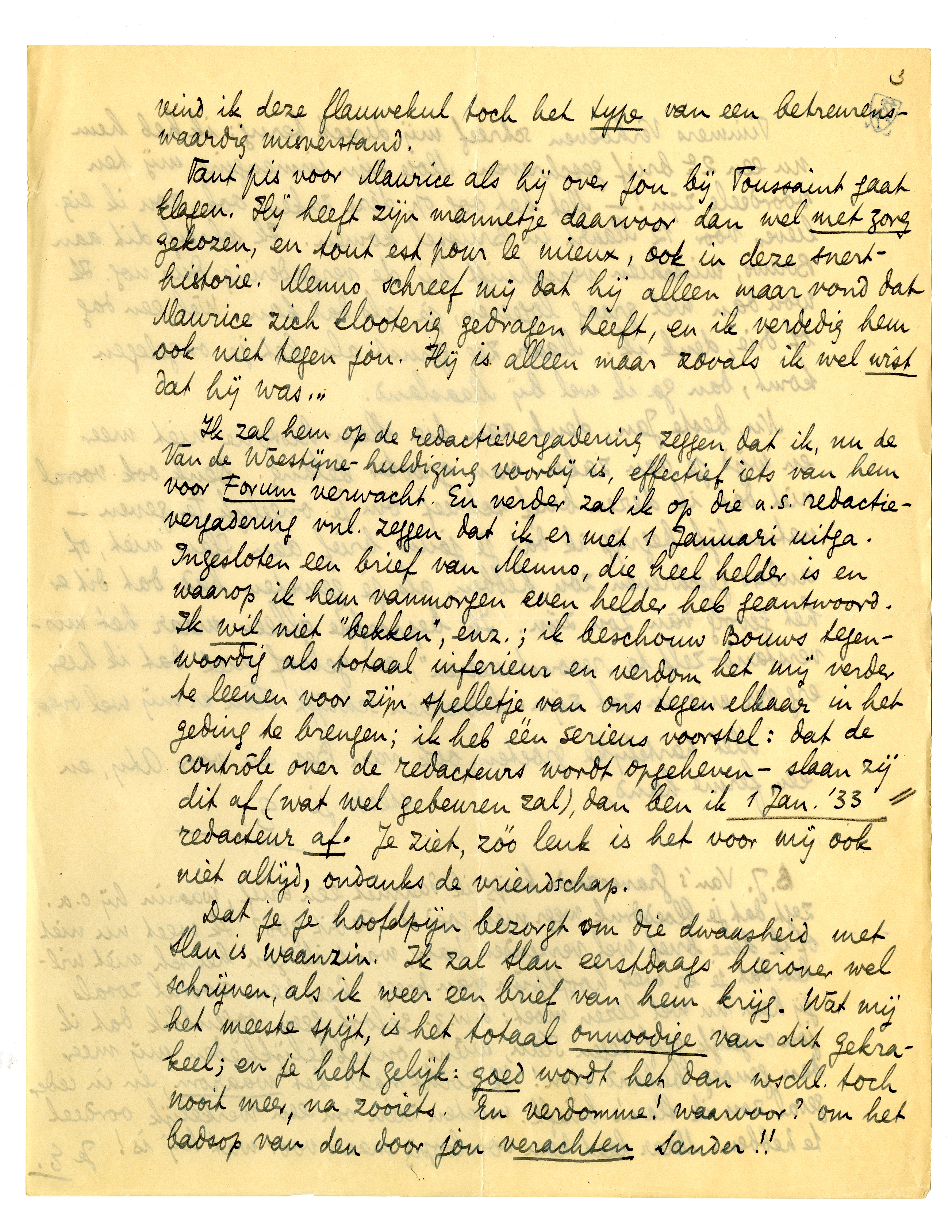 Ik zal hem op de redactievergadering zeggen dat ik, nu de Van de Woestijne-huldiging voorbij is, effectief iets van hem voor Forum verwacht. En verder zal ik op die a.s. redactievergadering vnl. zeggen dat ik er met 1 Januari uitga. Ingesloten een brief van Menno,2569 die heel helder is en waarop ik hem vanmorgen even helder heb geantwoord. Ik wil niet ‘bekken’, enz.; ik beschouw Bouws tegenwoordig als totaal inferieur en verdom het mij verder te leenen voor zijn spelletje van ons tegen elkaar in het geding te brengen; ik heb één serieus voorstel: dat de contrôle over de redacteurs wordt opgeheven - slaan zij dit af (wat wel gebeuren zal), dan ben ik 1 Jan. '332570 redacteur af. Je ziet, zóó leuk is het voor mij ook niet altijd, ondanks de vriendschap.