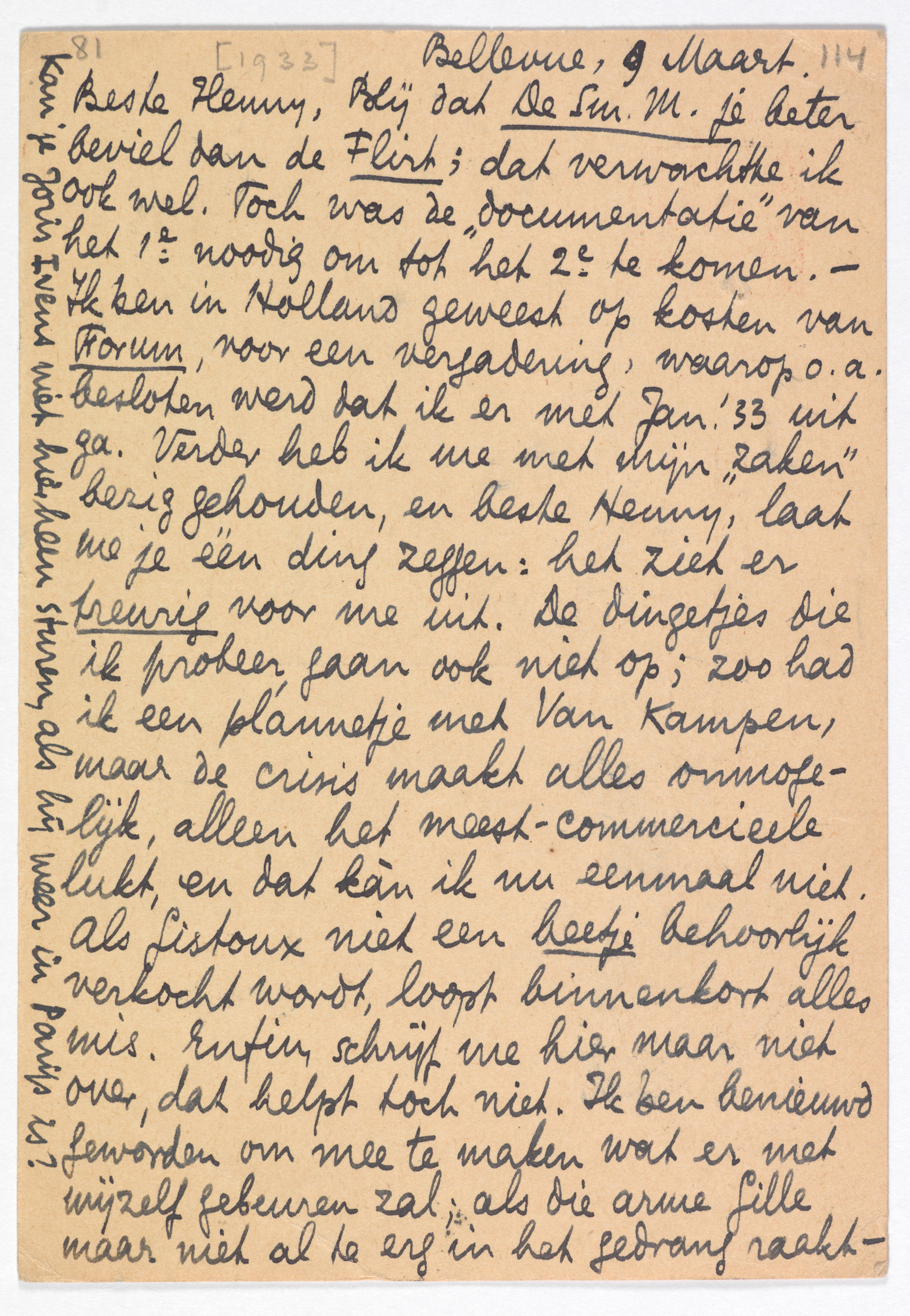 Beste Henny, Blij dat De Sm. M. je beter beviel dan de Flirt; dat verwachtte ik ook wel. Toch was de ‘documentatie’ van het 1e noodig om tot het 2e te komen. - Ik ben in Holland geweest op kosten van Forum, voor een vergadering, waarop o.a. besloten werd dat ik er met Jan. '332576 uit ga. Verder heb ik me met mijn ‘zaken’ bezig gehouden, en beste Henny, laat me je één ding zeggen: het ziet er treurig voor me uit. De dingetjes die ik probeer, gaan ook niet op; zoo had ik een plannetje met Van Kampen, maar de crisis maakt alles onmogelijk, alleen het meest-commercieele lukt, en dat kàn ik nu eenmaal niet. Als Gistoux niet een beetje behoorlijk verkocht wordt, loopt binnenkort alles mis. Enfin, schrijf me hier maar niet over, dat helpt toch niet. Ik ben benieuwd geworden om mee te maken wat er met mijzelf gebeuren zal; als die arme Gille maar niet al te erg in het gedrang raakt - de ‘groote menschen’ zullen zich wel redden. Plannen vertel ik je maar niet, want we maken er 2 per dag en vernietigen dan weer 14 in de week. - Je 2 verzen2577 waren best; je stuk2578 inderdaad wat martelaarachtig (slechte invloed, dacht ik zelfs, van den straatventer2579) maar toch niet om terug te nemen. Verander een paar dingen voor den toon, en schrap een beroerde tusschenzin over Andries de Hoghe,2580 en alles is best. Hartelijke groeten, ook voor Rien en van Bep,