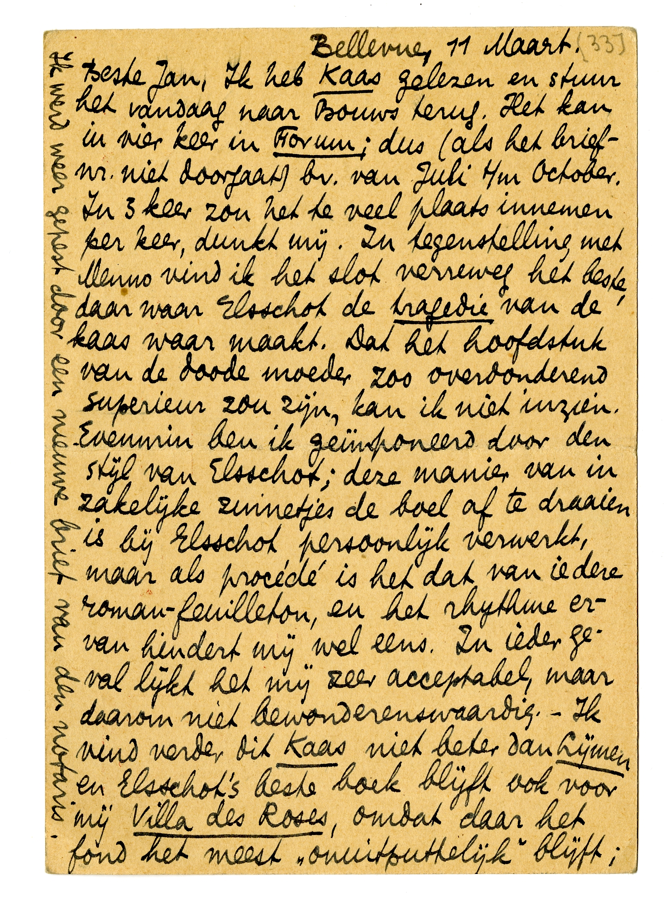 Beste Jan, Ik heb Kaas gelezen en stuur het vandaag naar Bouws terug. Het kan in vier keer in Forum; dus (als het brief nr. niet doorgaat) bv. van Juli t/m October. In 3 keer zou het te veel plaats innemen per keer, dunkt mij. In tegenstelling met Menno vind ik het slot verreweg het beste, daar waar Elsschot de tragedie van de kaas waar maakt. Dat het hoofdstuk van de doode moeder zoo overdonderend superieur zou zijn, kan ik niet inzien. Evenmin ben ik geïmponeerd door den stijl van Elsschot; deze manier van in zakelijke zinnetjes de boel af te draaien is bij Elsschot persoonlijk verwerkt, maar als procédé is het dat van iedere roman-feuilleton, en het rhythme ervan hindert mij wel eens. In ieder geval lijkt het mij zeer acceptabel, maar daarom niet bewonderenswaardig. - Ik vind verder dit Kaas niet beter dan Lijmen en Elsschot's beste boek blijft ook voor mij Villa des Roses, omdat daar het fond het meest ‘onuitputtelijk’ blijft; omdat daar dat ‘something’ is, dat ons een boek doet herlezen, wat ik bij zijn andere boeken niet heb, hoe voortreffelijk ik ze ook vind. - Een fout vind ik bepaald om de menschen hier nogmaals Laarmans en Boorman te noemen, en ze in zoo geheel andere omstandigheden te laten optreden; de ontmoeting met Boorman hier spreekt als het ware de ontm. met B. in Lijmen tegen. Is dat noodig? vooral waar B. hier zoo episodisch optreedt. - Nu, laat eens wat van je hooren. Hartelijk je