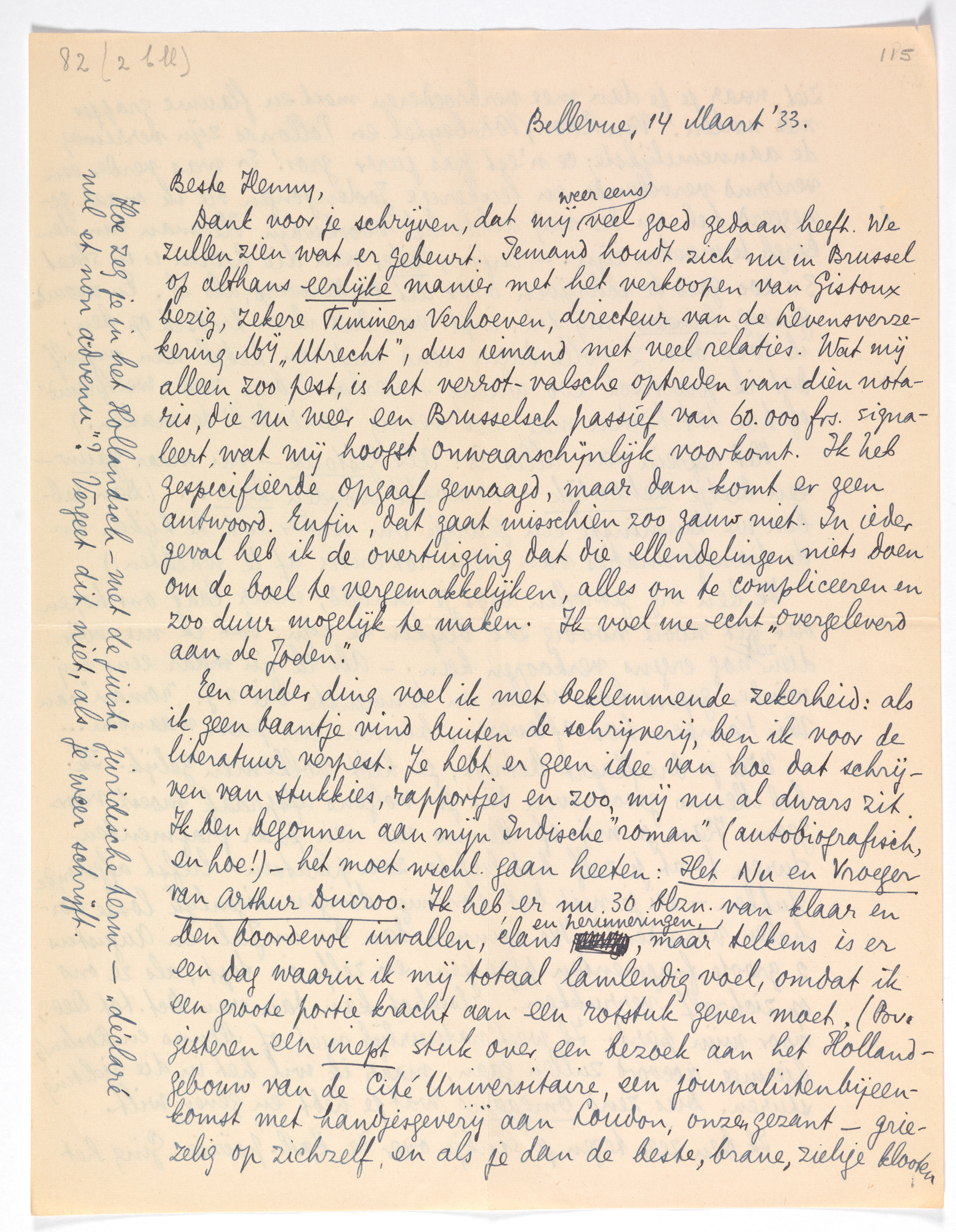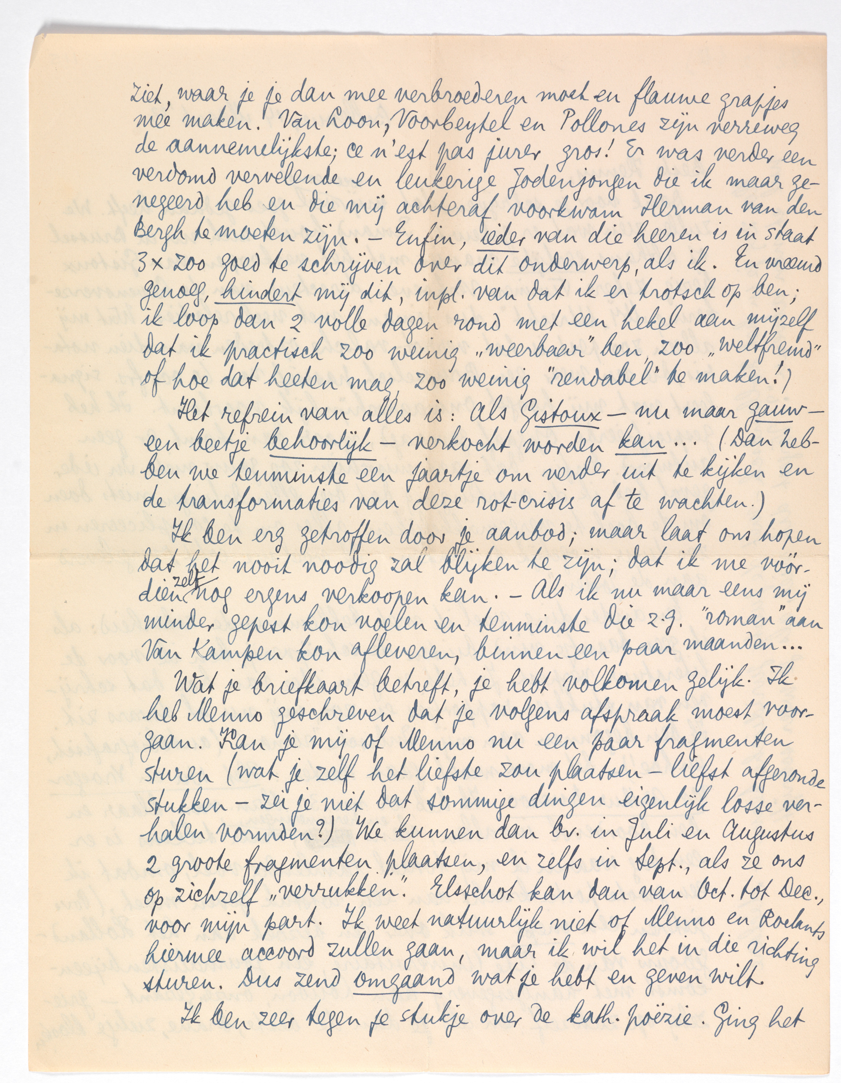Dank voor je schrijven, dat mij weer eens veel goed gedaan heeft. We zullen zien wat er gebeurt. Iemand houdt zich nu in Brussel op althans eerlijke manier met het verkoopen van Gistoux bezig, zekere Timmers Verhoeven, directeur van de Levensverzekering Mij ‘Utrecht’, dus iemand met veel relaties. Wat mij alleen zoo pest, is het verrot-valsche optreden van dien notaris, die nu weer een Brusselsch passief van 60.000 frs. signaleert, wat mij hoogst onwaarschijnlijk voorkomt. Ik heb gespecifieerde opgaaf gevraagd, maar dan komt er geen antwoord. Enfin, dat gaat misschien zoo gauw niet. In ieder geval heb ik de overtuiging dat die ellendelingen niets doen om de boel te vergemakkelijken, alles om te compliceeren en zoo duur mogelijk te maken. Ik voel me echt ‘overgeleverd aan de Joden’.