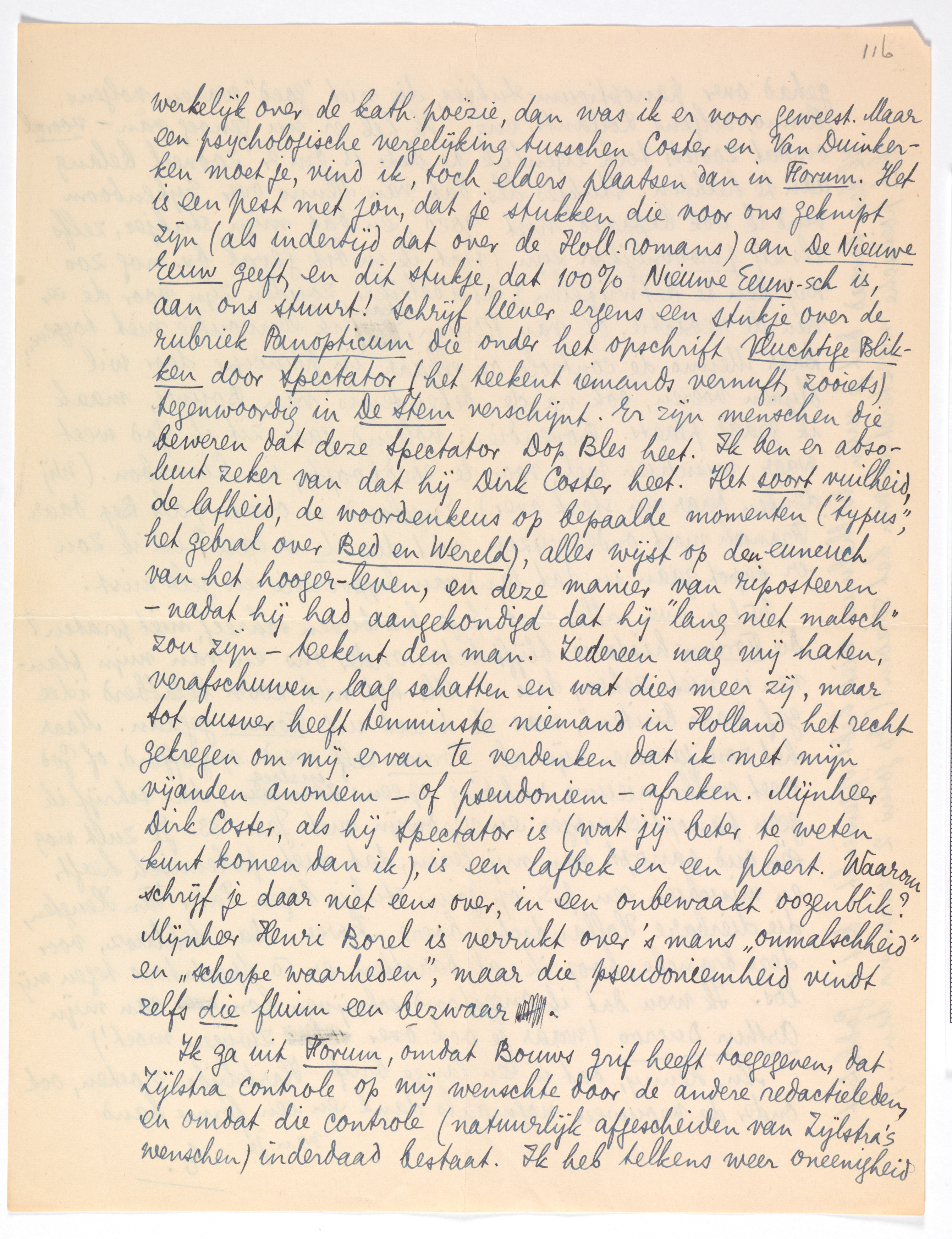 Ik ben zeer tegen je stukje over de kath. poëzie.2586 Ging het werkelijk over de kath. poëzie, dan was ik er voor geweest. Maar een psychologische vergelijking tusschen Coster en Van Duinkerken moet je, vind ik, toch elders plaatsen dan in Forum. Het is een pest met jou, dat je stukken die voor ons geknipt zijn (als indertijd dat over de Holl. romans) aan De Nieuwe Eeuw geeft, en dit stukje, dat 100% Nieuwe Eeuw-sch is, aan ons stuurt! Schrijf liever ergens een stukje over de rubriek Panopticum die onder het opschrift Vluchtige Blikken door Spectator (het teekent iemands vernuft, zooiets) tegenwoordig in De Stem verschijnt. Er zijn menschen die beweren dat deze Spectator Dop Bles heet. Ik ben er absoluut zeker van dat hij Dirk Coster heet. Het soort vuilheid, de lafheid, de woordenkeus op bepaalde momenten (‘typus’, het gebral over Bed en Wereld), alles wijst op den euneuch van het hooger-leven, en deze manier van riposteeren - nadat hij had aangekondigd dat hij ‘lang niet malsch’ zou zijn - teekent den man. Iedereen mag mij haten, verafschuwen, laag schatten en wat dies meer zij, maar tot dusver heeft tenminste niemand in Holland het recht gekregen om mij ervan te verdenken dat ik met mijn vijanden anoniem - of pseudoniem - afreken. Mijnheer Dirk Coster, als hij Spectator is (wat jij beter te weten kunt komen dan ik), is een lafbek en een ploert. Waarom schrijf je daar niet eens over, in een onbewaakt oogenblik? Mijnheer Henri Borel is verrukt over 's mans ‘onmalschheid’ en ‘scherpe waarheden’, maar die pseudoniemheid vindt zelfs die fluim een bezwaar.2587